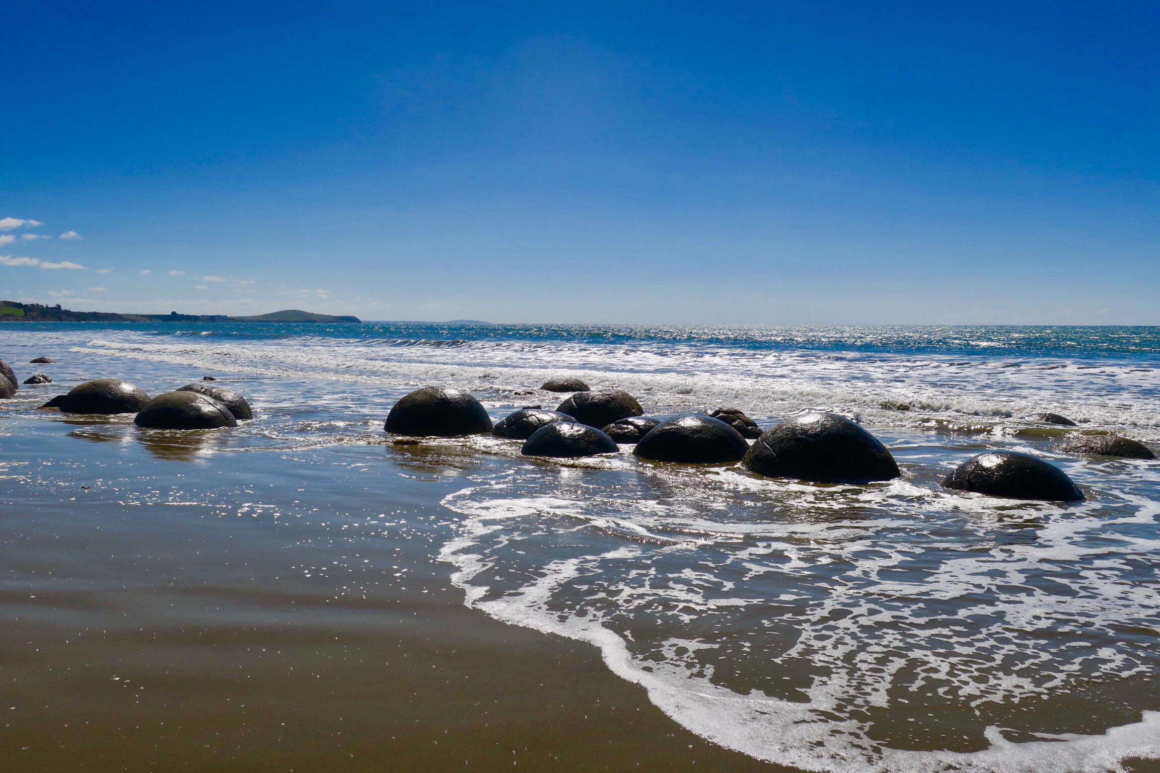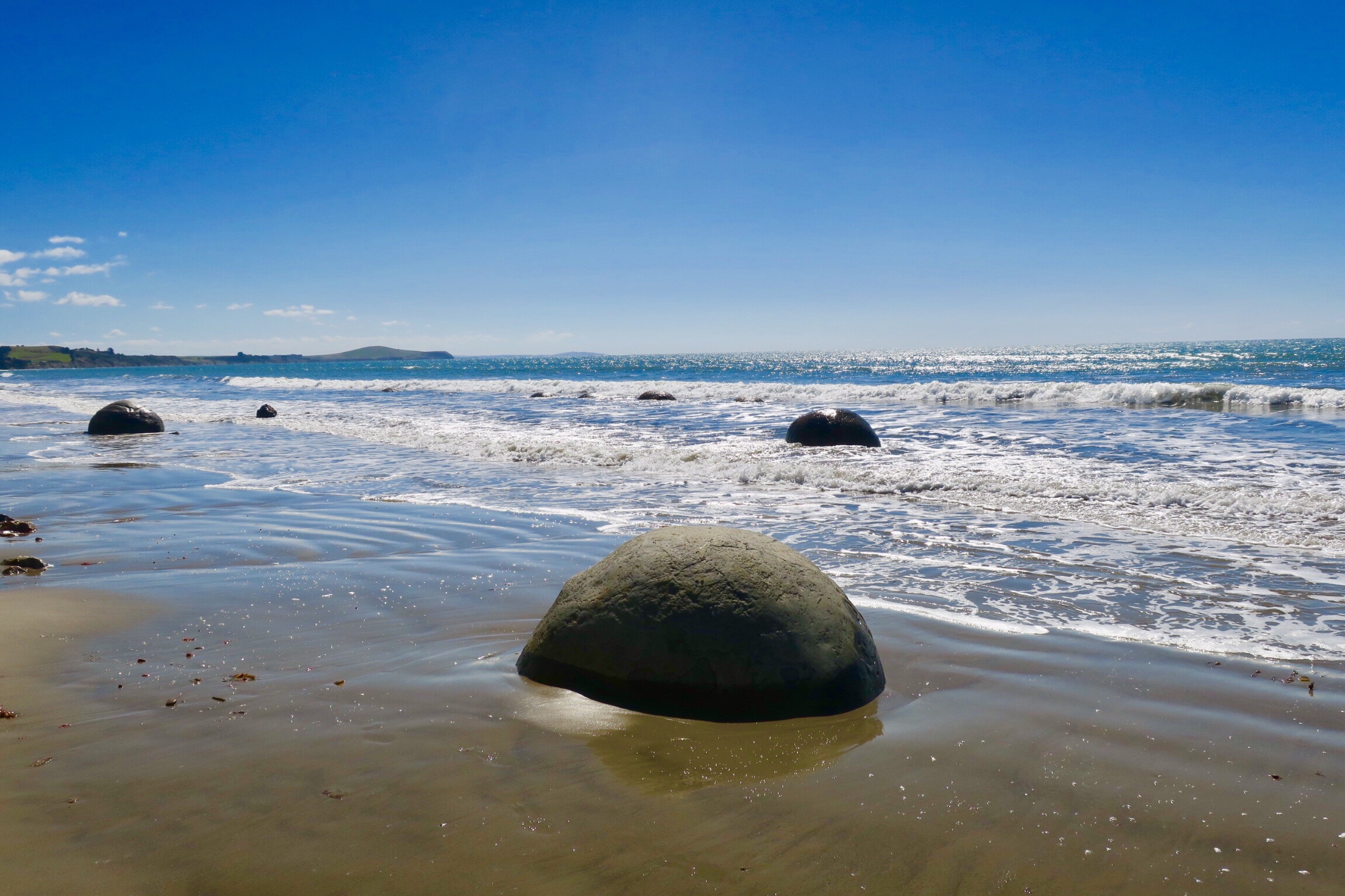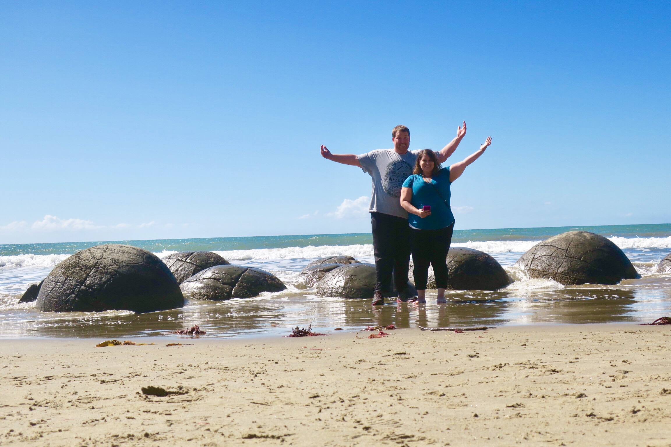 The next day, officially on our way to Christchurch, we stopped at the Moeraki Boulders – unusually large, perfectly smooth surfaced boulders sitting right on the beach and embedded into the sand made up of mud, fine silt and clay, cemented by calcite. They are quite the sight! We had fun going to see them, hopping on top and walking up and down the beach with our feet in the sand and ocean.