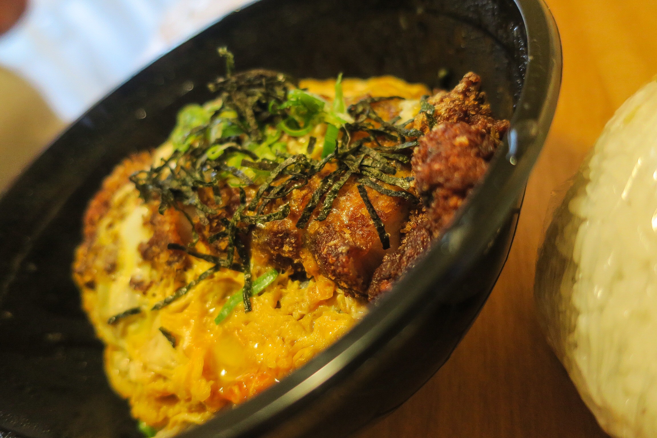 Our first night we searched for a while trying to find somewhere to eat that wasn’t insanely expensive (to our standards) or fast food. Luckily, we stumbled upon a Japanese place (shocker!) called Hachi Hachi. We both got Donburi, which is a rice bowl dish that can have different types of meat, fish and sauces on top. Dean got the Pork Kastu Don which is a crispy pork cutlet with a scrambled egg on top. They covered it all in a sweet Teriyaki style sauce and plopped all of that on a big bowl of rice. I got pretty much the same thing, but with crispy chicken. On our way out we noticed that at the end of each night, they put their pre-made sushi rolls on sale for half price! Since we hadn’t really eaten all day (do granola bars and potato chips count?), we decided to treat ourselves and get a few rolls to share as well. We got a crispy tempura veggie roll, a chicken teriyaki roll and they even had a huge rice ball stuffed with Karaage chicken! (Crispy chicken in a sweet sauce) We devoured it all and it totally hit the spot.