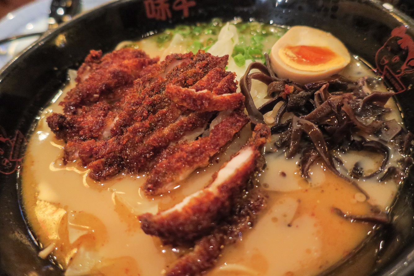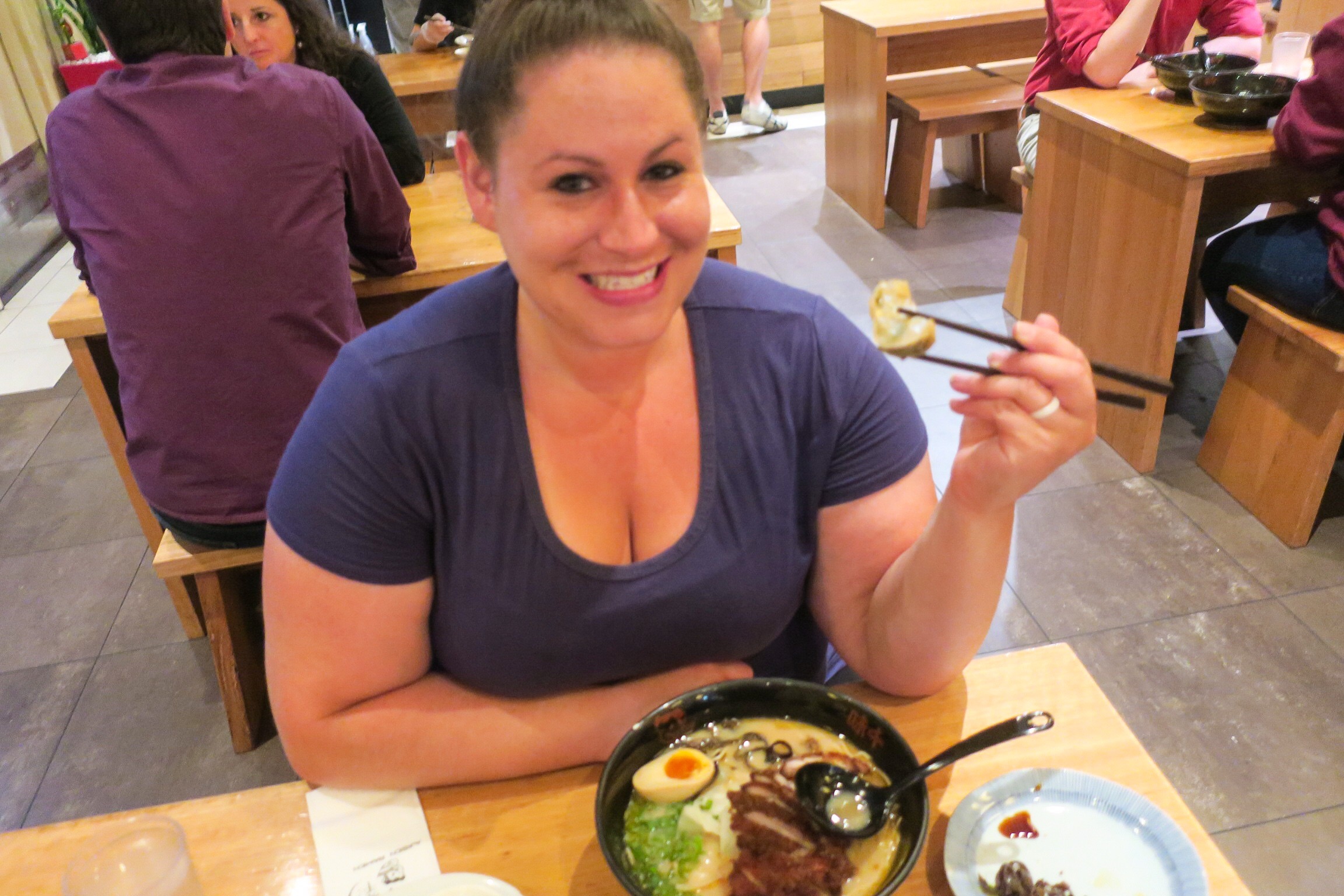 Ajiseen Ramen: Man, was this place good! My first true ramen experience and it didn’t disappoint! I started with the vegetable gyoza. Pan fried dumplings stuffed with vegetables. Not the mushy mix you get at Chinese restaurants, this place had real fresh veggies inside their gyoza. Yum! Dean got spicy pork gyoza and BAM! It sure packed a punch! His gyoza were sitting in a bowl of spicy, vinegary pork broth which made it all the more delicious. We both got a bowl of ramen for dinner. (duh!) I got a crispy chicken breast on mine and Dean had spicy beef rib on his. Both were served in broth made from pork bones. Usually I would shy away, as I don’t eat anything but chicken, but something told me to just stop thinking about it and enjoy this porky brothy goodness and I’m so happy I did. Dean, being the chef he is, told me that when they boil the broth for hours and hours, the fat from the pork bones emulsifies into the broth and that’s what gives it so much flavor and milky appearance. It’s almost creamy without having any cream or dairy in it. So smooth and silky! The bowls were loaded with delicious ramen noodles, seaweed, cabbage and a soft boiled egg along with our meats of choice.
