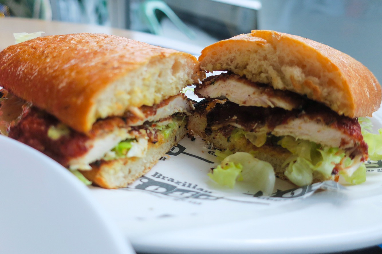 Fogo Brazilia Churrasco: Inside the Heritage Mall we chose this quick serve Brazilian steakhouse restaurant. I got a thinly pounded chicken breast with their house mayo. Not quite sure what was in it, but it definitely had a kick! Dean got the Brasilia wrap. Chicken, chorizo and eye round beef wrapped up with lettuce, tomato and topped with a Harissa mayo as well as that delicious house mayo. They had all the meat on a spit that was slowly cooked as it rotated above the flame and even sliced all the meat off the spit to order! Just like at the traditional Brazilian steakhouse restaurants, Dean was able to choose a nice piece of rare meat as he was slicing it for his meal.