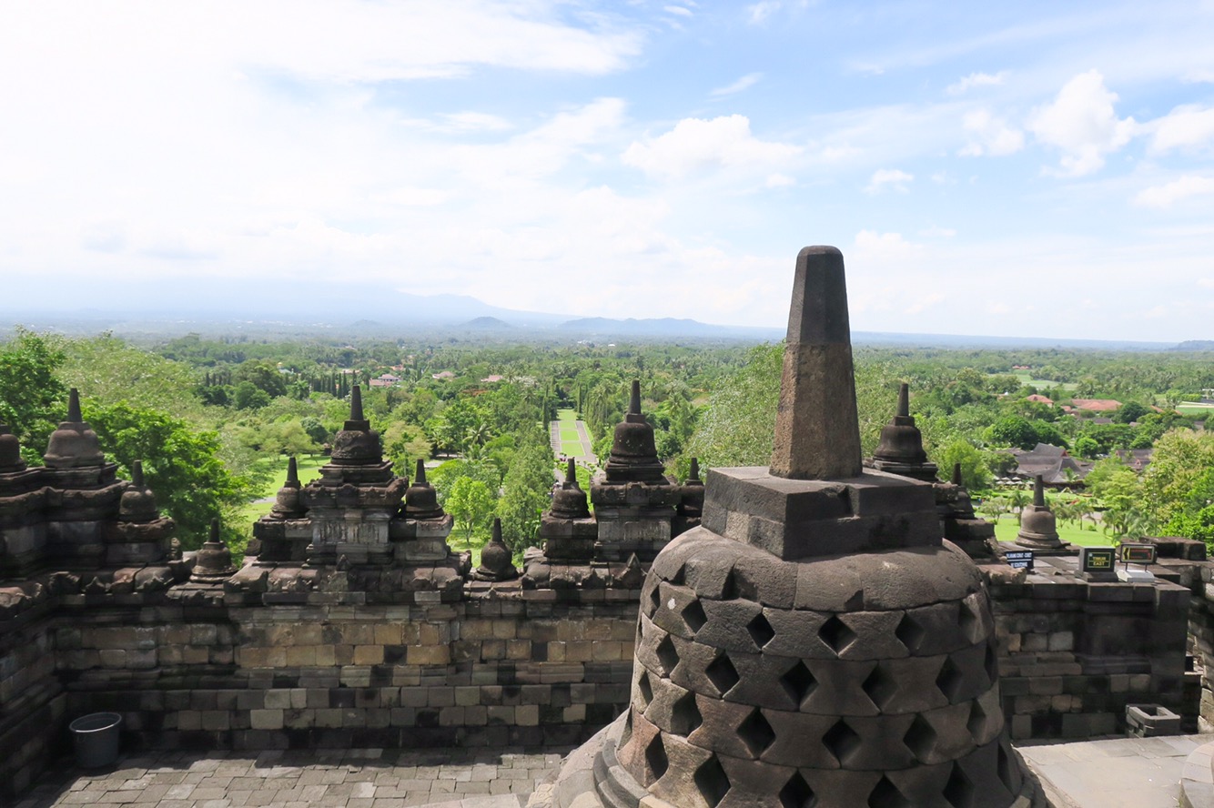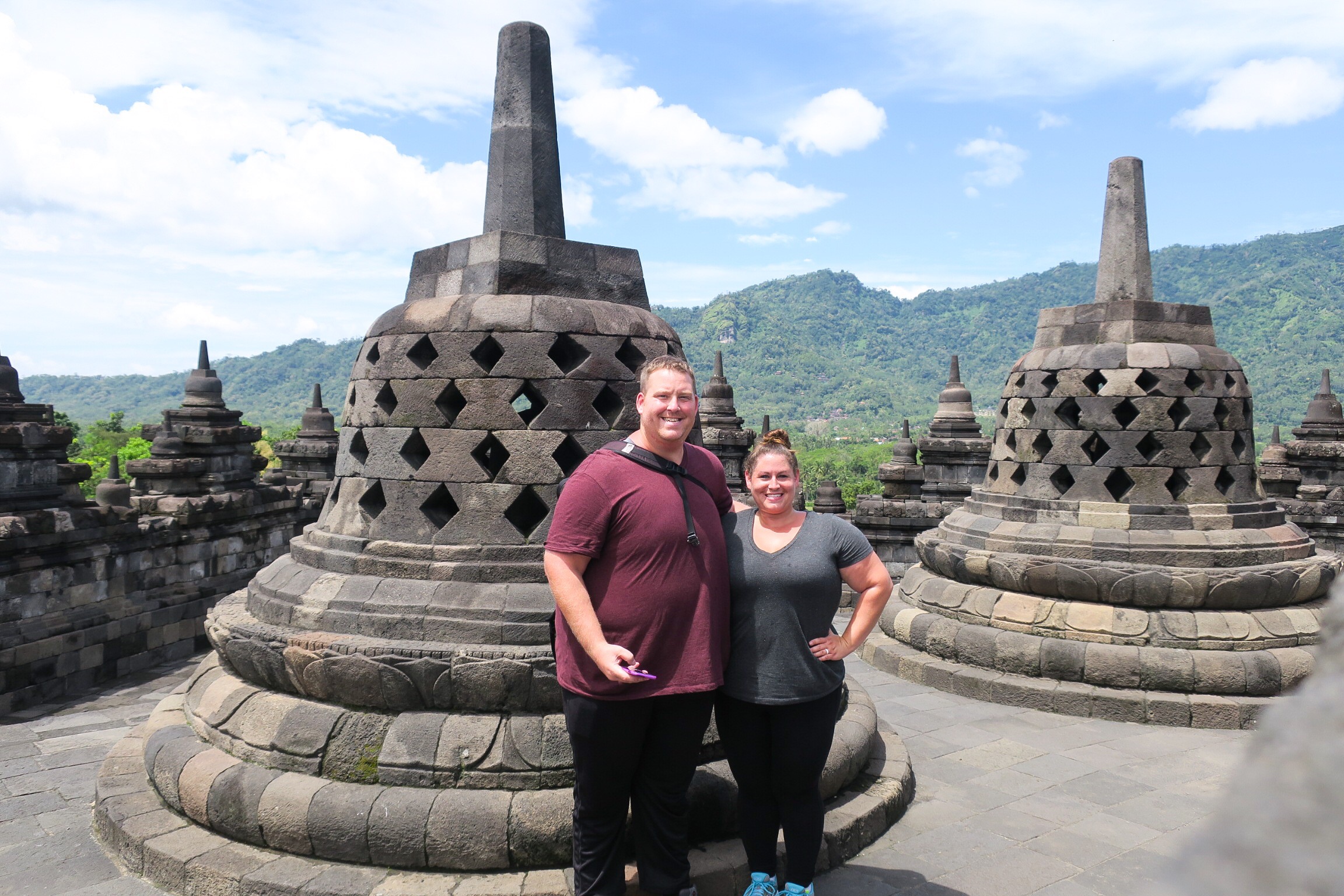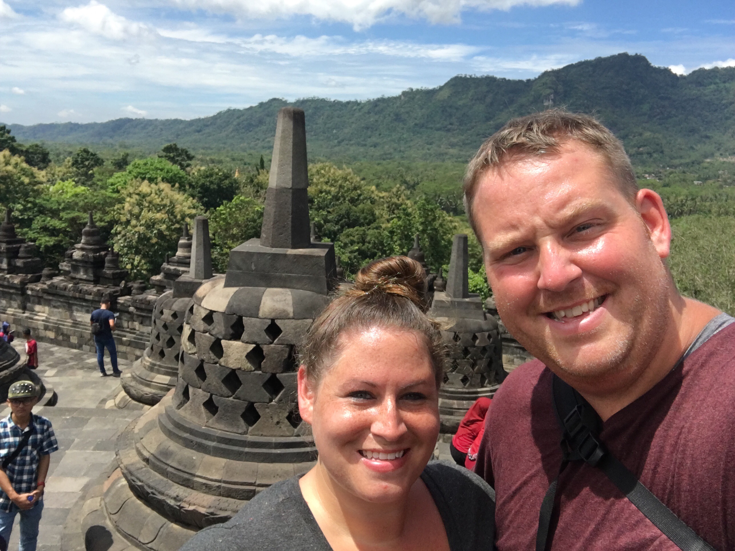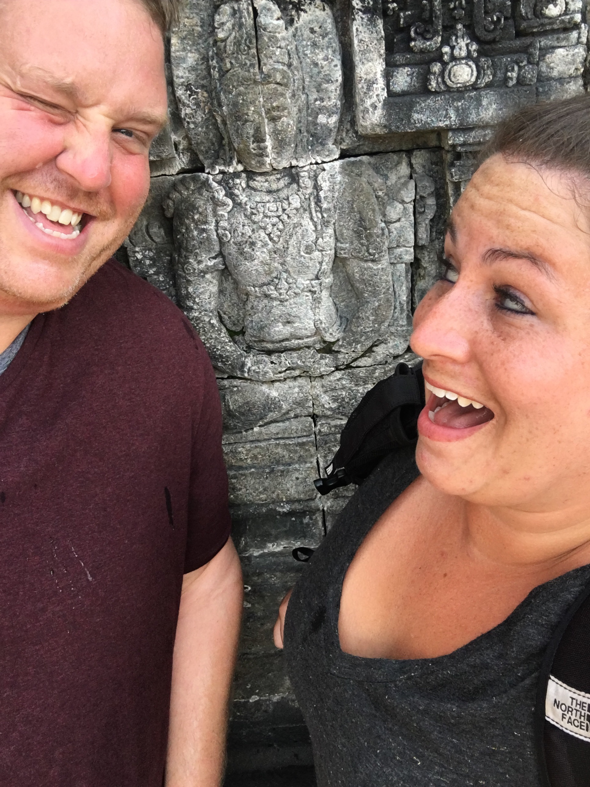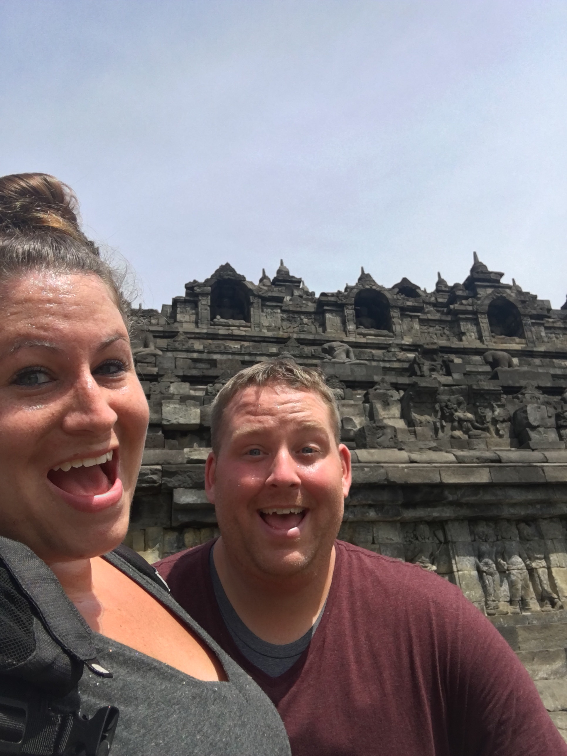 Jogja is most known for its temples, specifically the Borobudur and Prambanan, and that is the main reason we came here. There are a few ways you can see these temples. The first is by hiring a private car to take you to both. Similar to the one in Bali, you pay a flat rate for 8-10 hours. The ones here seemed to be on the more expensive side, but a quick trip to the tourism office (located on Malioboro street with the nicest people to help) proved to pay off as we were able to find one that would be with more people but for less than half the price! We ended up paying 240,000 for 8 hours (about $20USD). We picked up a great Australian couple who were in town for a habitat for humanity house build, and we were off! First was Borobudur, a Buddhist temple built in the 9th century, located about an hour and a half out of town. Drenched in sweat from the second we exited the car, we ascended with the enormous temple complex growing larger in our sightline. It’s hard to describe the feeling as you get closer. It’s awe inspiring! The architecture, the history, it’s almost overwhelming! 9 staked platforms, each one carved with an intricate scene or design and 504 Buddha statues seated atop the stepped levels. It was an amazing sight. The top level housed an enormous bell surrounded by smaller bells with a Buddha in each one. Aside from all the other tourists, it felt peaceful and completely transported us to a different time. Such an incredible sight to see.