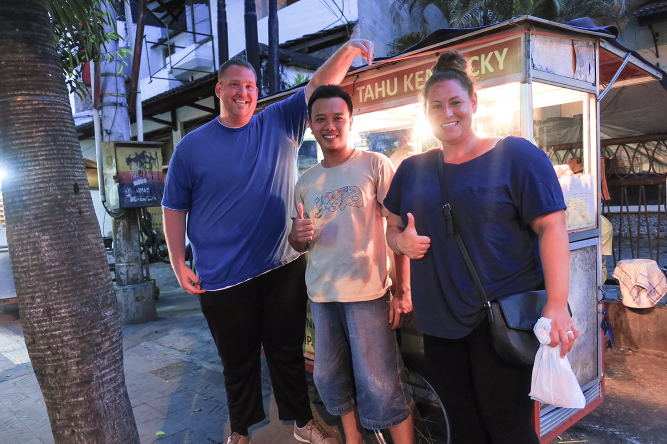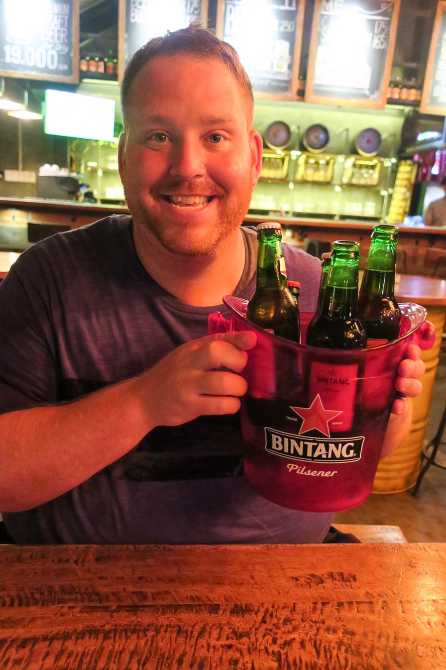 Sakapatat Social House: We have so many amazing things to say about Sakapatat. Tucked away in an alley, off the main road and away from all the beeping cars and scooters whizzing away lies what we call “hipster paradise”. You’re completely transported into a little oasis of great music, delicious (even though it was non-traditional) food and cheap Bintang beer. We loved to here so much we went twice! We tried their spinach and cheese fritters, corn nuggets and some of their burgers. I got “El Gingo”. Fried chicken with guacamole and a Chile mayo. Dean got “Zorro”, a burger with mozzarella, lettuce, tomato and crispy fried onions all served on a deep black charcoal bun. That was the best part! The second night we went they had free beer! Yes, FREE! Friday nights are free flow beer until the first keg is out. Score!