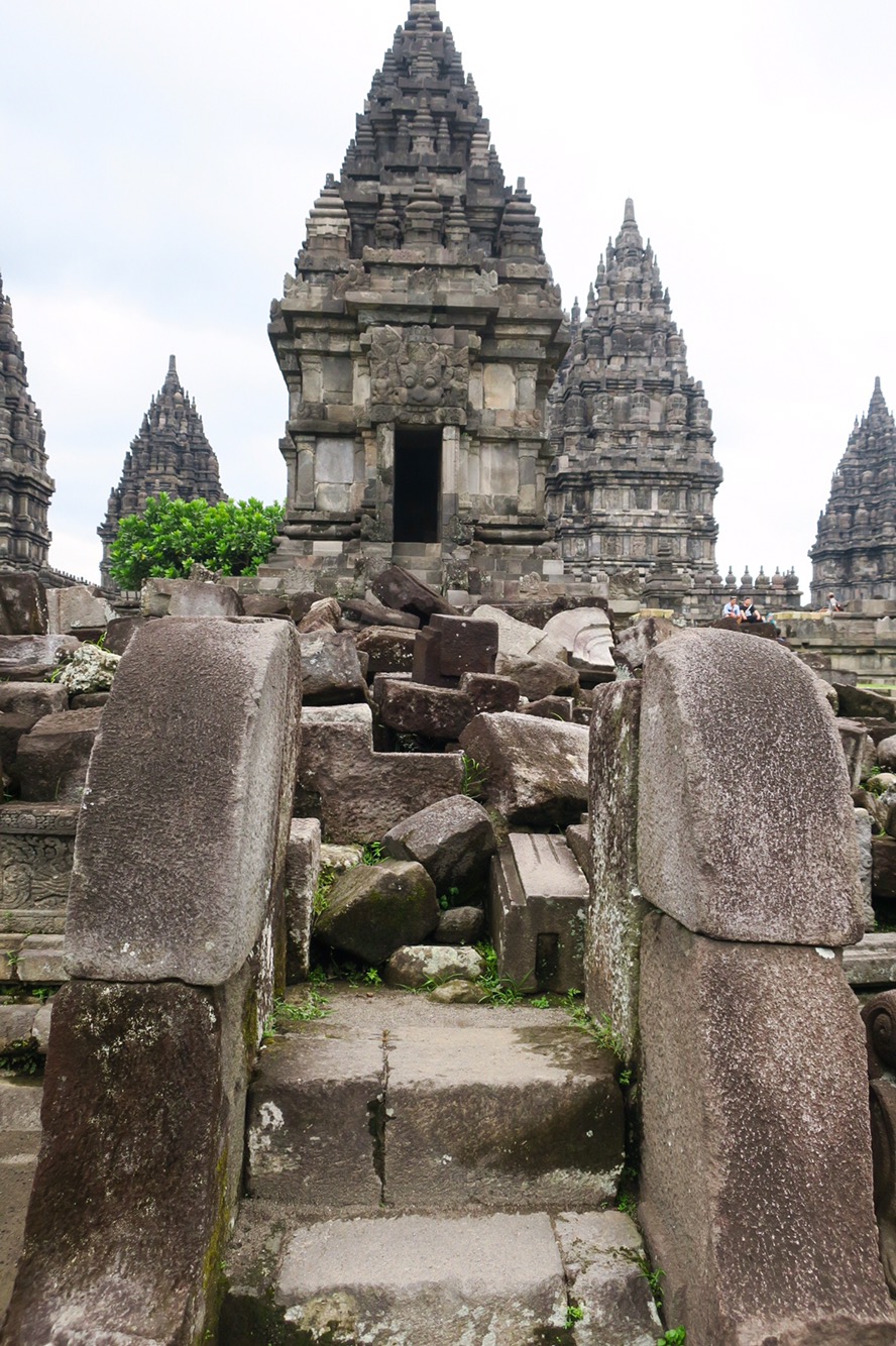 Completely drained from the hot sun, we ventured on and were off to Prabanan after dropping off our Australian friends. A Hindu temple, located much closer to town. The first thing that popped into our minds when we saw this was those little sand castles you build as a kid where you take wet sand and let it drip through your hand into a wet sand castle. Anyone remember doing that as a kid? As we got closer, however, each individual temple had its own identity. Each temple honored a different Hindu god but the biggest were for Shiva, Vishnu and Brahma, with many smaller temples to other Hindu gods. Many of the temples had turned to ruins over the years from neglect, volcanic activity and earthquakes, until the Dutch (Colonial occupiers) started to rebuild the grounds. Some have been rebuilt, others are in the process of being rebuilt and some sadly will never return.