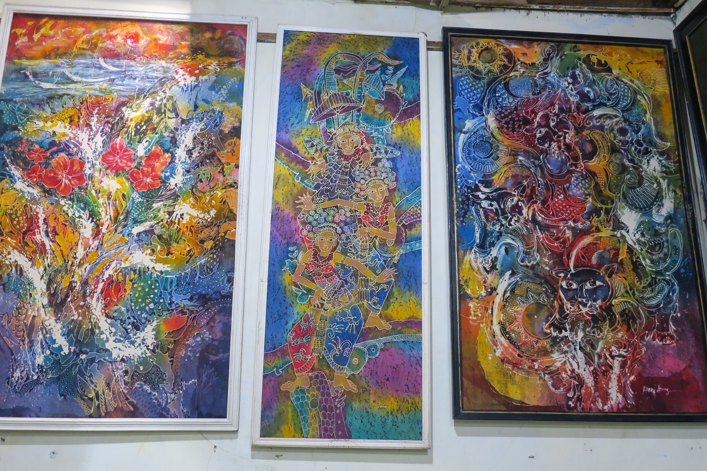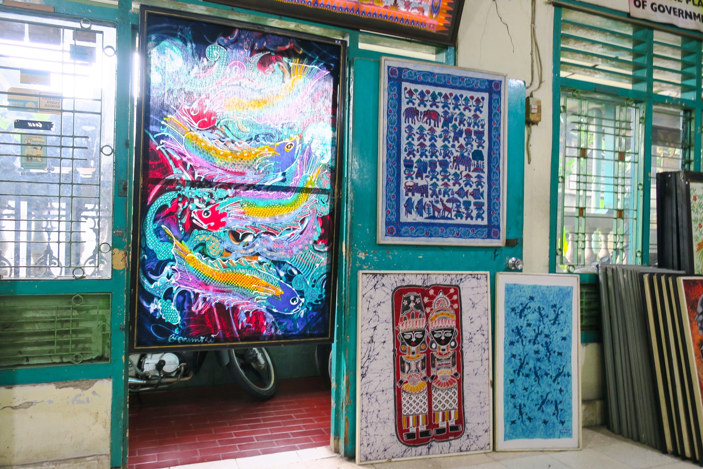 Intrigued with all the suggestions, we decided to make our way to the school winding our way through the streets and neighborhoods of Jogja. True Indonesia! We must have looked lost, because a friendly man started chatting with us and when we told him where we were going, he ended up walking is all the way to the school. We were sure was going to ask for a “donation”, but he brought us to the school and said “Okay, well I live a few streets away so… bye bye!” Such a nice friendly man. We’re sorry we doubted his good deed! The school turned out to be more like a gallery, but was filled with all different Batik paintings. Batik is a style of art which starts with a piece of cotton. The artist first outlines their design with pencil and then fills in certain areas with wax. There are two different types of waxed used, beeswax and candle wax. Once the wax is placed in certain areas, the entire piece is dipped in dye of the color of choice. It dyes the areas filled and unfilled differently. That dries and more areas are filled and then dipped again. It is a long process but the result is incredible and one of a kind. We, of course, had to get one to take home!