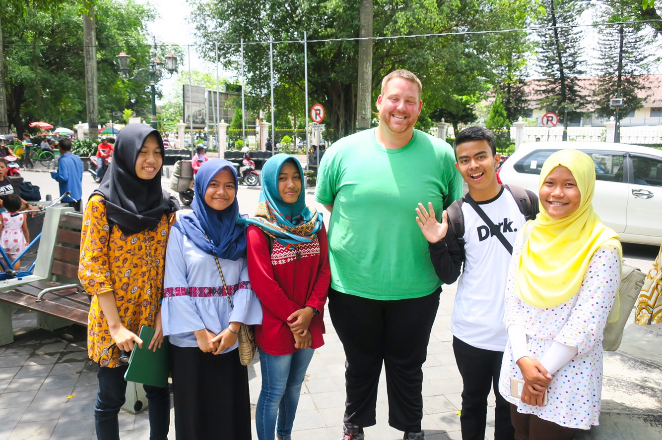 Malioboro street was lined vendors selling shirts, bracelets, bags, sunglasses etc. As we were walking around, taking in all the sights and smells, locals kept coming up to us just to chat. They asked us where we were from, which sparked all kinds of questions. “Ohhh America?! California or New York?!” It was funny to see their perspective of where we are from. It was always followed up by “Obama!” Clearly they haven’t gotten the news yet… Everyone was so friendly and very excited and intrigued to see some real life tall blonde haired (more like sun bleached brunette) Americans! We were even interviewed by some students and of course did the obligatory Instagram selfie!