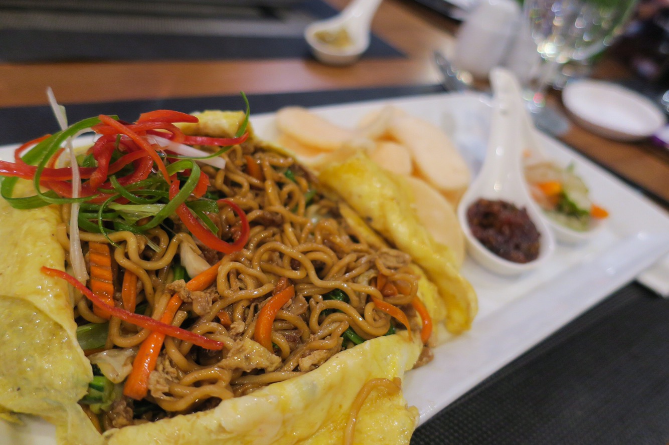 Rustik at Harper Hotel: Since it was raining on our first night and we weren’t yet familiar with the area, we decided to have dinner at our hotel and it was a great restaurant! First it was a delicious drink for me. Vanilla ice cream, milk and blue curaçao! (Anything blue and I’m sold!) It was basically a blue milkshake, yum! For dinner, Dean got a coconut curried lamb stew with steamed rice and a tasting spoon of some crazy hot chilies, Spicy! He loved it. For me, stir fried noodles wrapped in an egg omelet. Dessert was fabulous. Green Tea Panna Cotta and Ginger Lemongrass Creme Brûlée. They also had an amazingly impressive breakfast buffet! From omelets to Nasi Goreng (friend rice) and Mie Goreng (fried noodle) and even a traditional Jogja corner with Ayam Pop (chicken stew) and Beef Skin Soup. They also had a huge array of juices, both vegetable and fruit. It was fabulous!