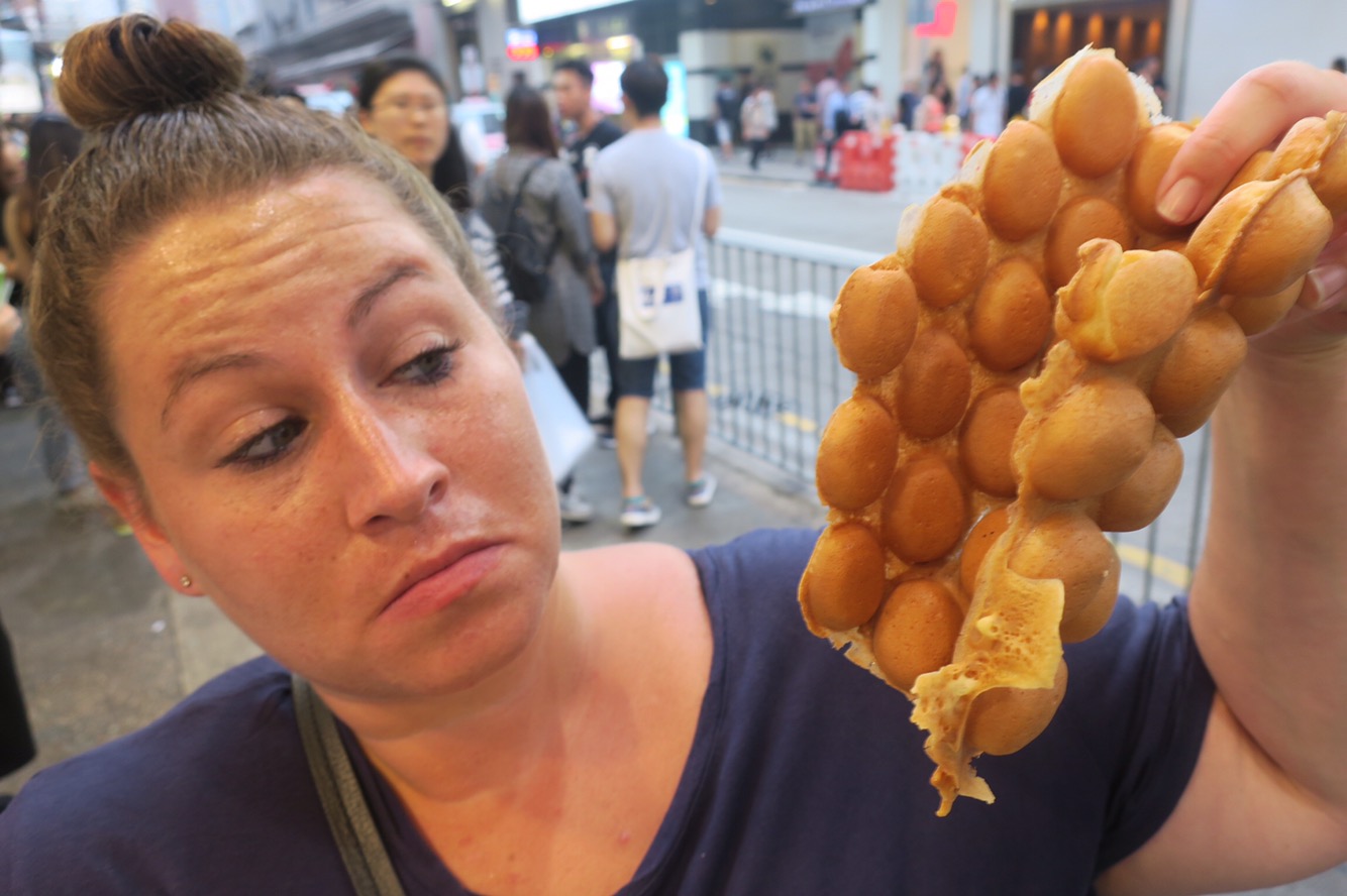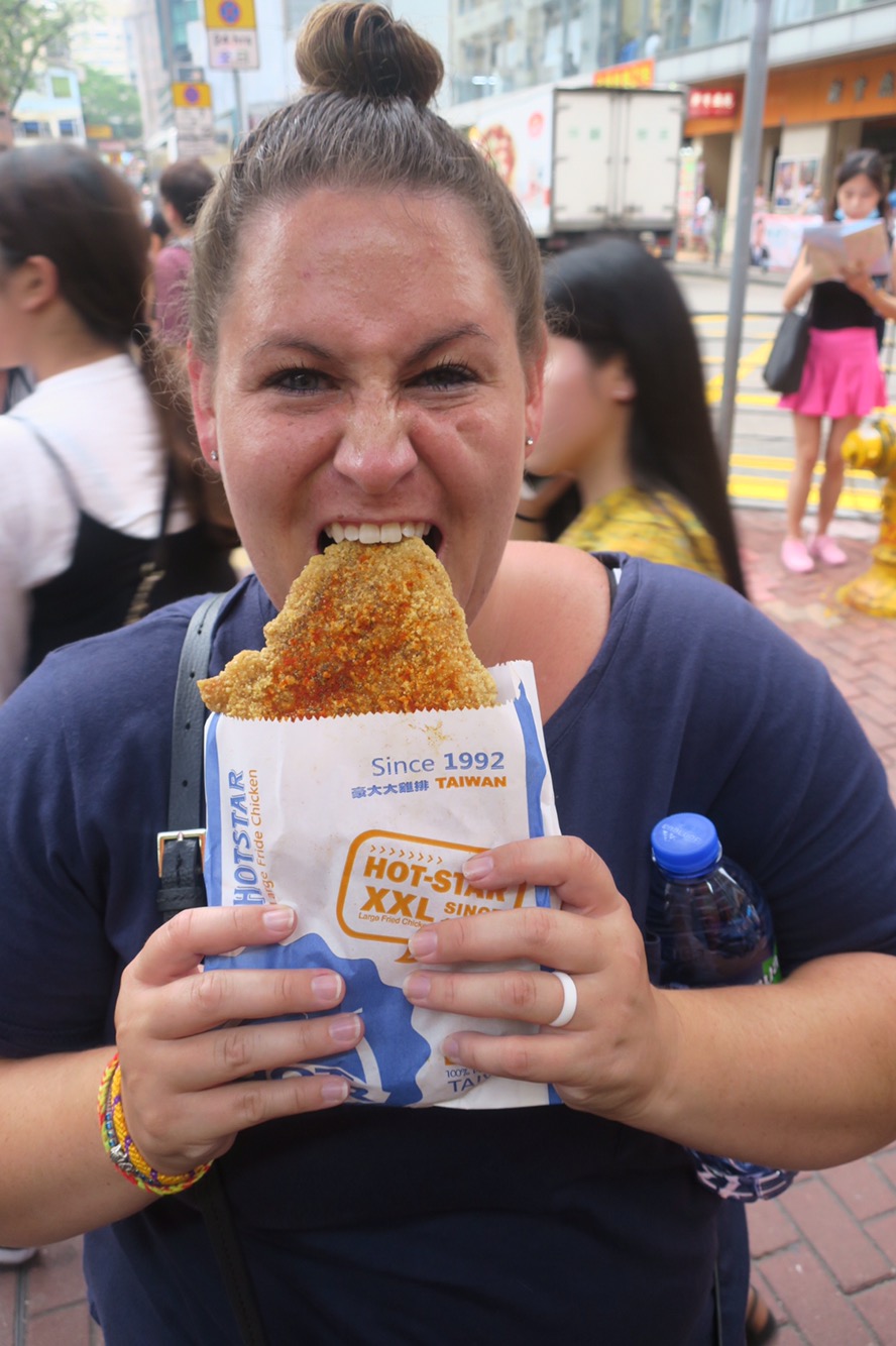 Various Street Food: Street food is a must in Hong Kong and Maceo took us to the top spots. We tried traditional steam buns first. Chicken and mushroom for me, BBQ pork for Dean and we shared a taro variation for a touch of sweetness and fun because it was purple. Next up was a freshly made “pancake” which was similar to a crepe but very crispy! It was filled with blueberry compote and sweetened condensed milk. After that, we saw a chicken stand, Hot Star Taiwanese Fried Chicken, and figured we should get some protein in. Literally any kind of fried chicken you could ever want. Regular, spicy, whole chicken, chicken nuggets, chicken balls, you name it. We got one big piece of spicy to all share, so good! After that, with our tummies starting to get fuller and fuller, we had to get the well known Hong Kong bubble waffle! A true art form. It tastes like a regular waffle but the style in which it’s cooked makes it all the more fun. They can be topped or stuffed with a variety of flavors but we wanted the classic version. Last but not least, we tried the famous milk tea. Any flavor you want, a sweet drink to wash all the delicious street food town. Dean chose Peppermint Green Tea, Maceo got the Earl Grey, and I got the traditional version. A great tour of all the street food that contributes to making this city so much fun. We needed to head back to the hotel for a nap after this carbo load!