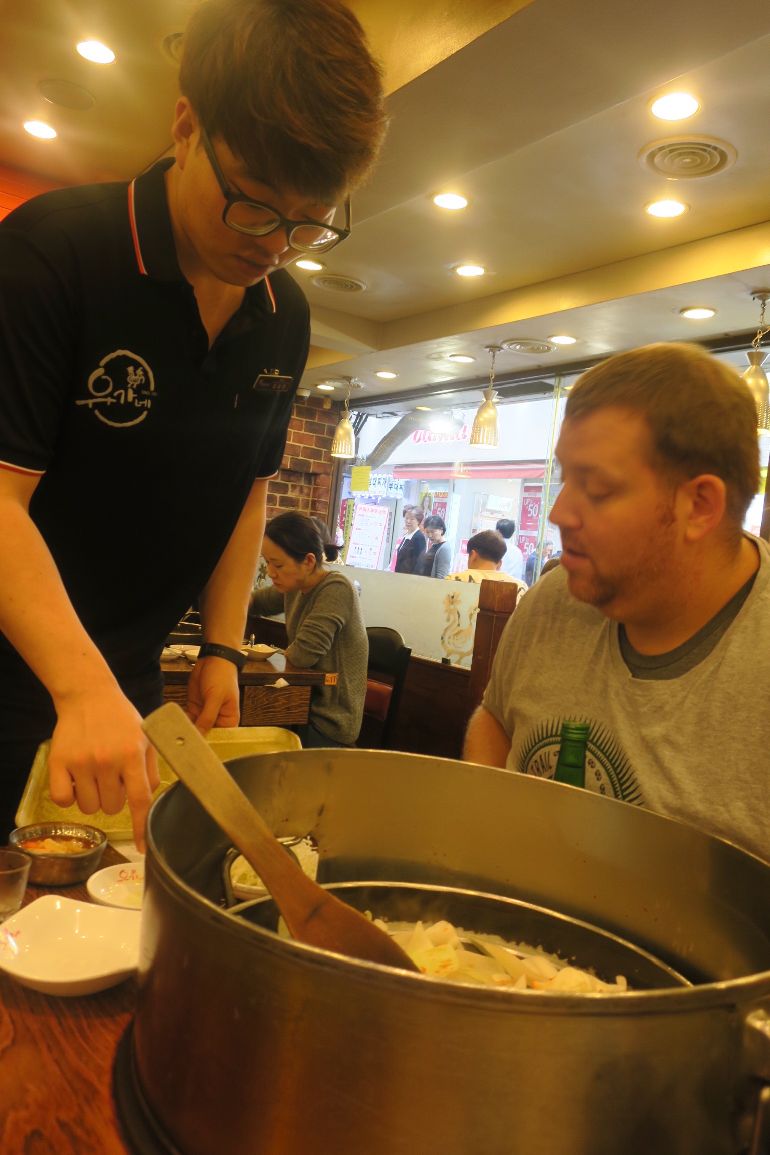 Last stop was the grand finale… KFC! No no, not the colonel … Korean Fried Chicken! Dean has made this multiple times and we couldn’t wait to try it in its homeland… it definitely didn’t disappoint! The chunks of crunchy chicken were battered fried and lathered in sauce that was sweet, sour and had a little kick from the spicy Korean chili paste gochujang. Part of Kisuks plan was to pair each restaurant with a different Korean alcohol, Ginseng wine with the first dish, Soju with the second and the third was beer. Of course we had to have a bottle of peace Soju another bottle of grapefruit but the best part for Dean and Kisuk, they ordered a 2 liter tower of beer! More theatrics than anything, it was fun to see them with their own large tower of beer and remember the old times they had in college.