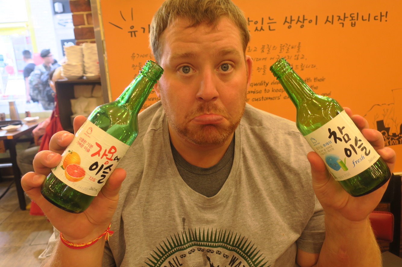 All that window shopping worked up quite the appetite and we found a place that cooked the food right in front of you called Yoogane’s. Each table had its own burner, you simply choose the dish you want, they bring it over and cook it in a large shallow bottomed pan and it’s yours within minutes! We chose the traditional variation. Marinated Chicken, rice, rice stick, scallions, cabbage and onions. Isn’t always more fun when the food is cooked right in front of you? Not sure why we got such a kick out of it, but we did, plus the flavor was amazing! Slightly spicy, but a great umami from the soy. We paired it with some traditional Korean Soju, if you’ve never had it, try it out! It falls somewhere in between wine and hard liquor in both the taste and alcohol level. We got the regular flavor, which just tasted a bit like cheap vodka and the grapefruit flavor, go with the latter, it was so good! It tasted just like juice, which makes it go down that much easier! The whole meal was so tasty and it was only $25USD, so a great price, especially in a touristy area.