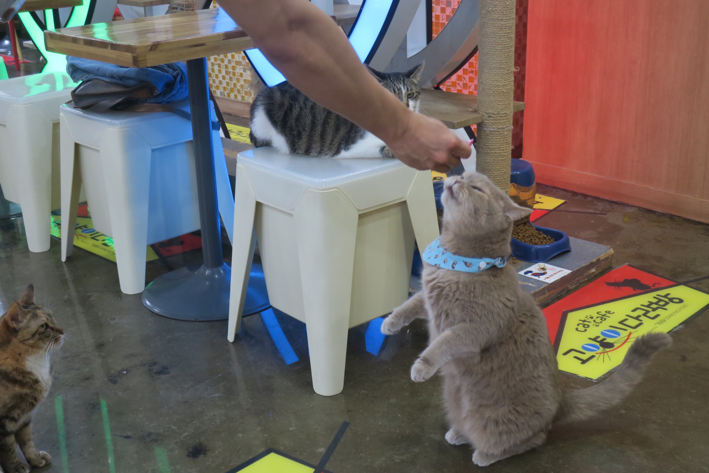 After lunch we saw a giant cat wandering the streets handing out free drink cards for the cat cafe. We’d seen them on TV and read about them, so when we saw one we had to check it out. On the top floor of one of the buildings, you head in, place your coffee order and enter a world filled with cats. Small, big, fluffy, hairless, shy and boisterous. We had way more fun hanging out and petting the kitties than we thought we would! The coffee was pretty decent but a bit pricy at about $8USD each, but since the price includes your entrance to the cafe and and apparently came with cat food that the owner spreads on your hands to get licked off by the cats! If you ever want to visit, walk through the streets of Myedeoung and look for the giant cat walking around handing our free drink coupons. Say hi to Teery, he’s the big guy that’s super fluffy and wears a bandana to note that he’s a little more sensitive!