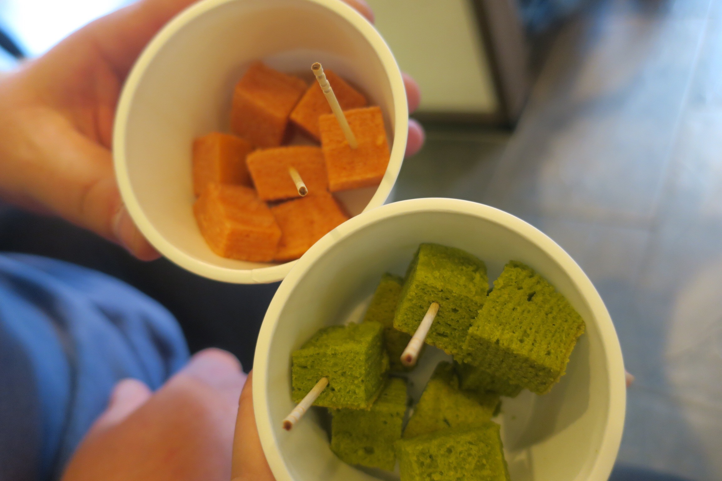 In Kyoto, we checked out Nishimi Market, a back alley walking street lined with shops, restaurants and all the street food you could ever want. We saw a German specialty, Baumkuchen, being made with the fun Japanese flavors like Matcha or more normal flavors like Strawberry. You’ve probably seen it before, the cake that is made by a rotating spit so it creates layers, but add in the matcha or strawberry flavor. (We tried both!)