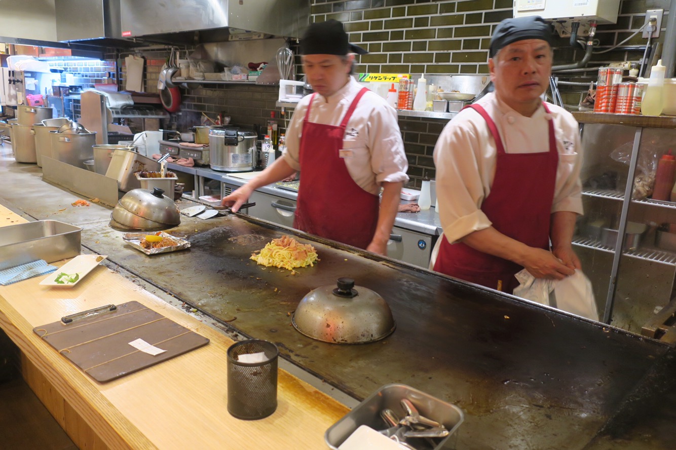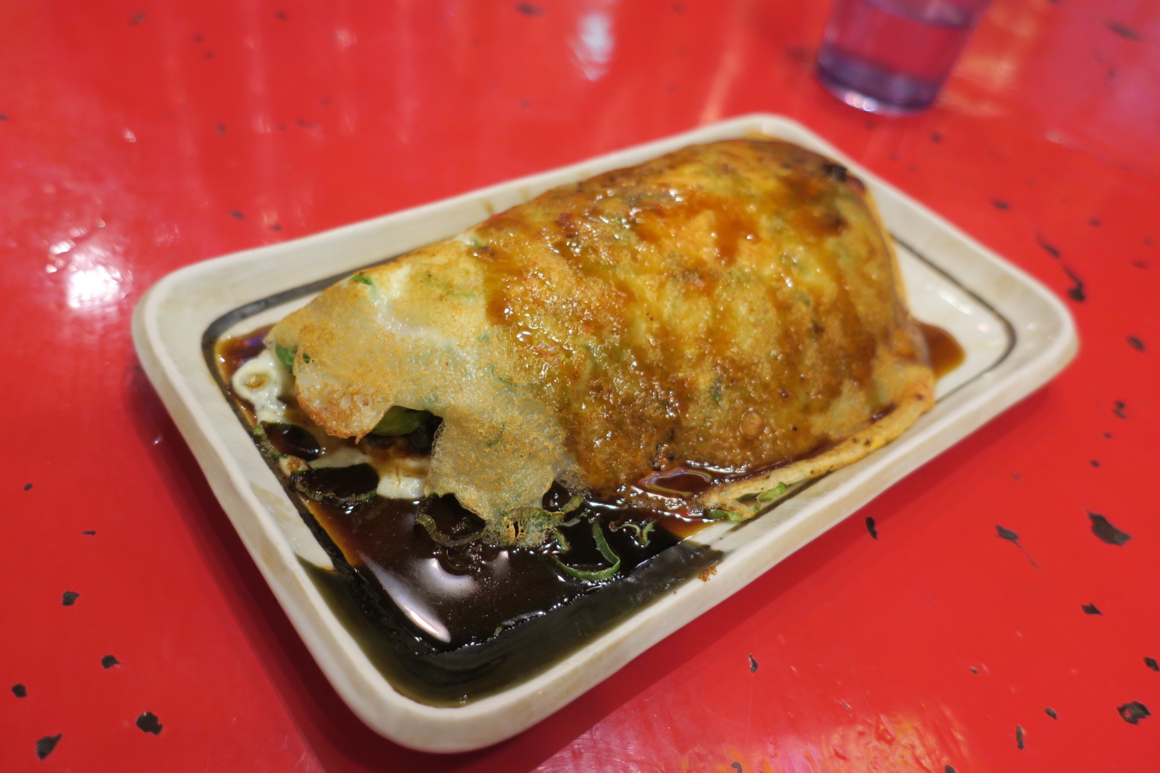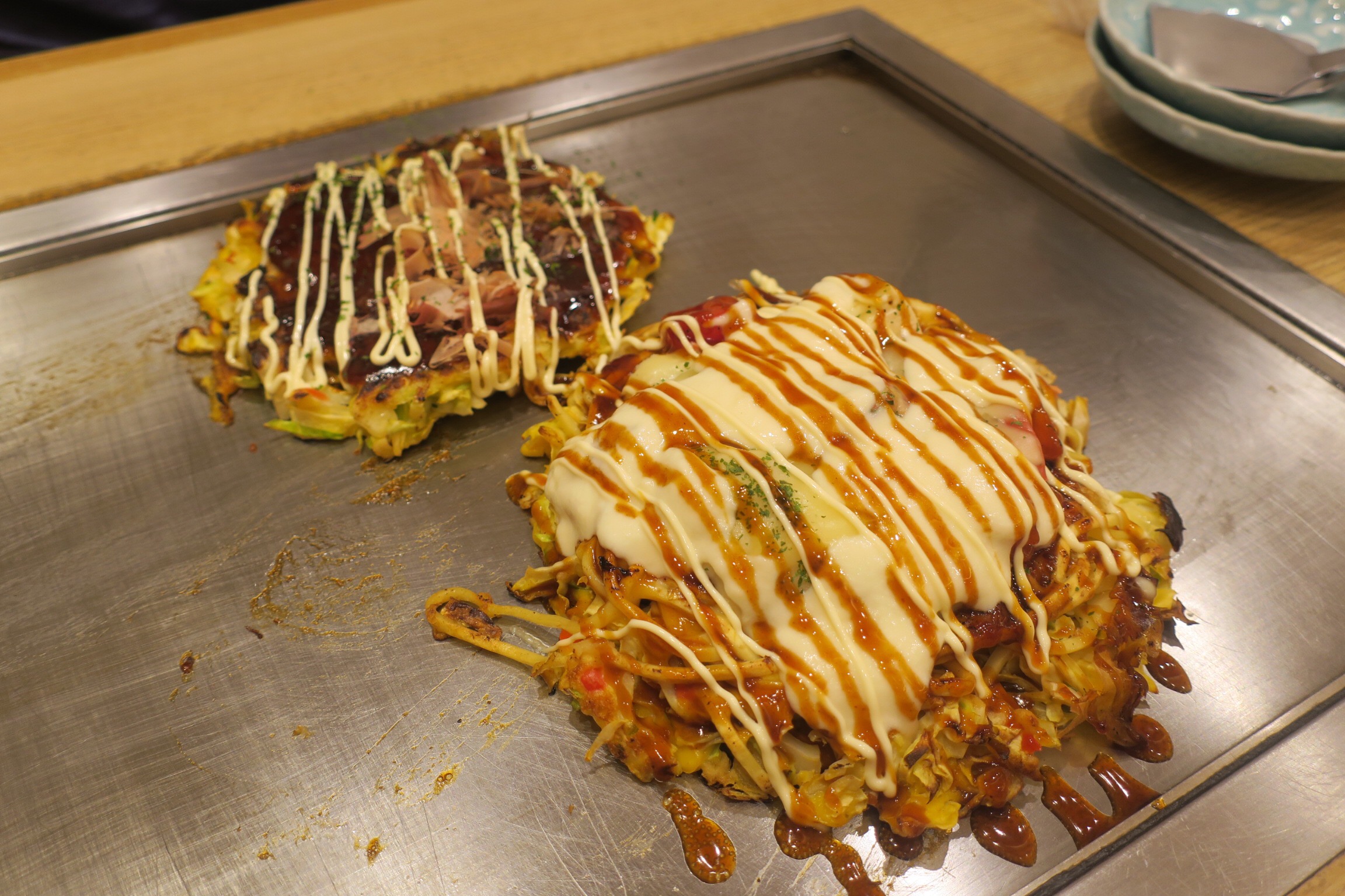 Kyoto Station, Porta Dining: We heard that the Kyoto train station had an awesome food hall on the 11th floor.. after many escalators and dancing LED stairs we realized it was more like many mini restaurants with a high price tag. Luckily, we had noticed Porta Dining on our way up, so after much disappointment on the 11th floor, we went down the many escalators to the basement of the station, through what turned into a mall and then into the dining section. Again, many different little restaurants but the price tag was more affordable and the atmosphere was less stuck up. We enjoyed it so much here we ate twice! The first place we checked out was known for its Okonomiyaki, the traditionally savory Japanese cabbage pancake. While the base is always the same, there are many varieties you can get. Dean chose a version with pork and mine was coated in cheese. Delish!