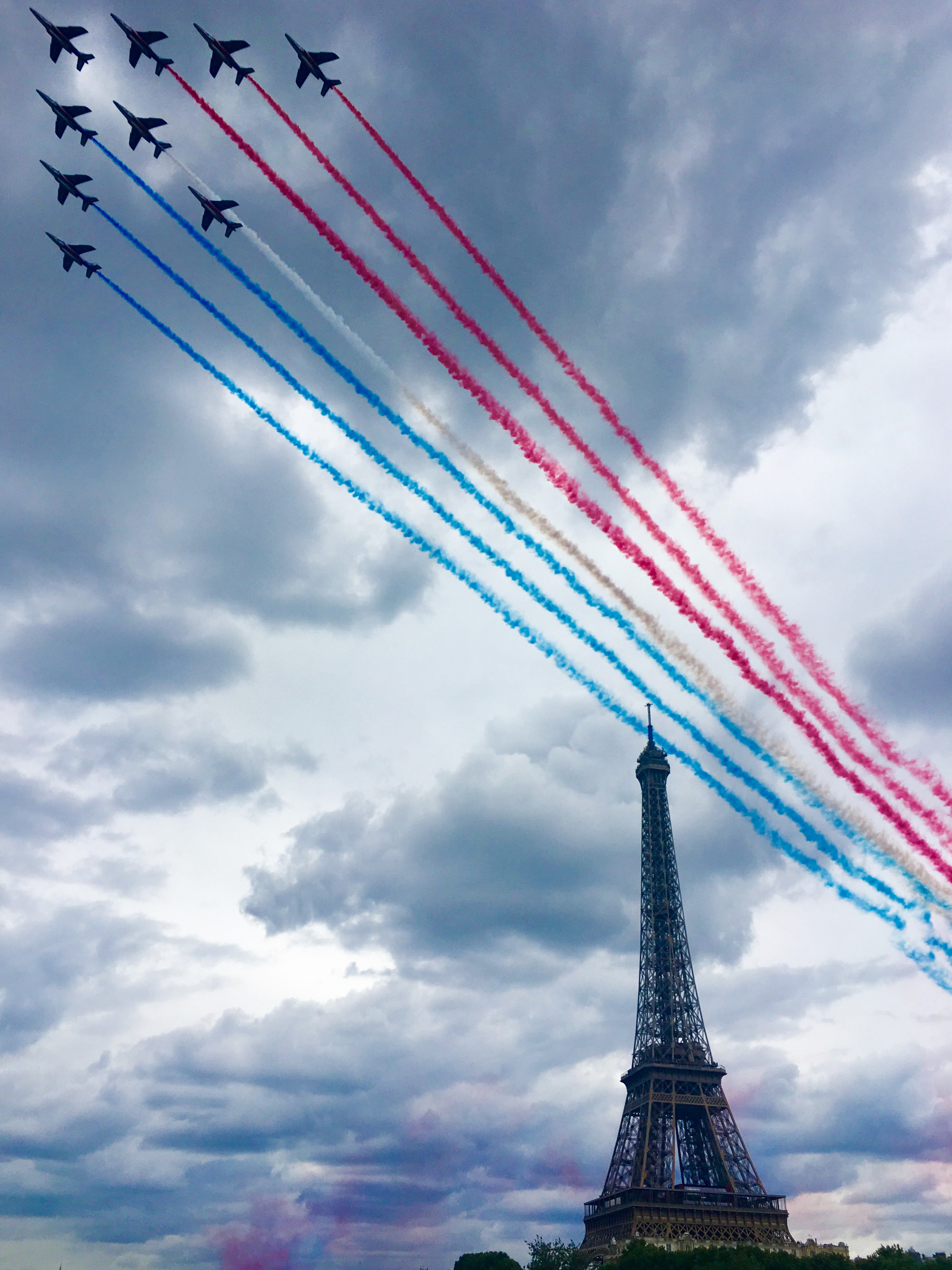Since the Tour De France was ending during our time here and we found ourselves with some time on its final day, we ran down to the Bir Hikim metro stop to see if we could catch the bikers as they made their way into Paris. Dean turned to me and said “I kinda wanna go see it, but we should go right now if we’re gonna go”. We threw on our shoes and got to the lookout point just in time not only to see the bikers make their way into the city, but to see some more planes fly over and drop their colorful french flag smoke! This time right next to the Eiffel Tower. How’s that for a sight?!