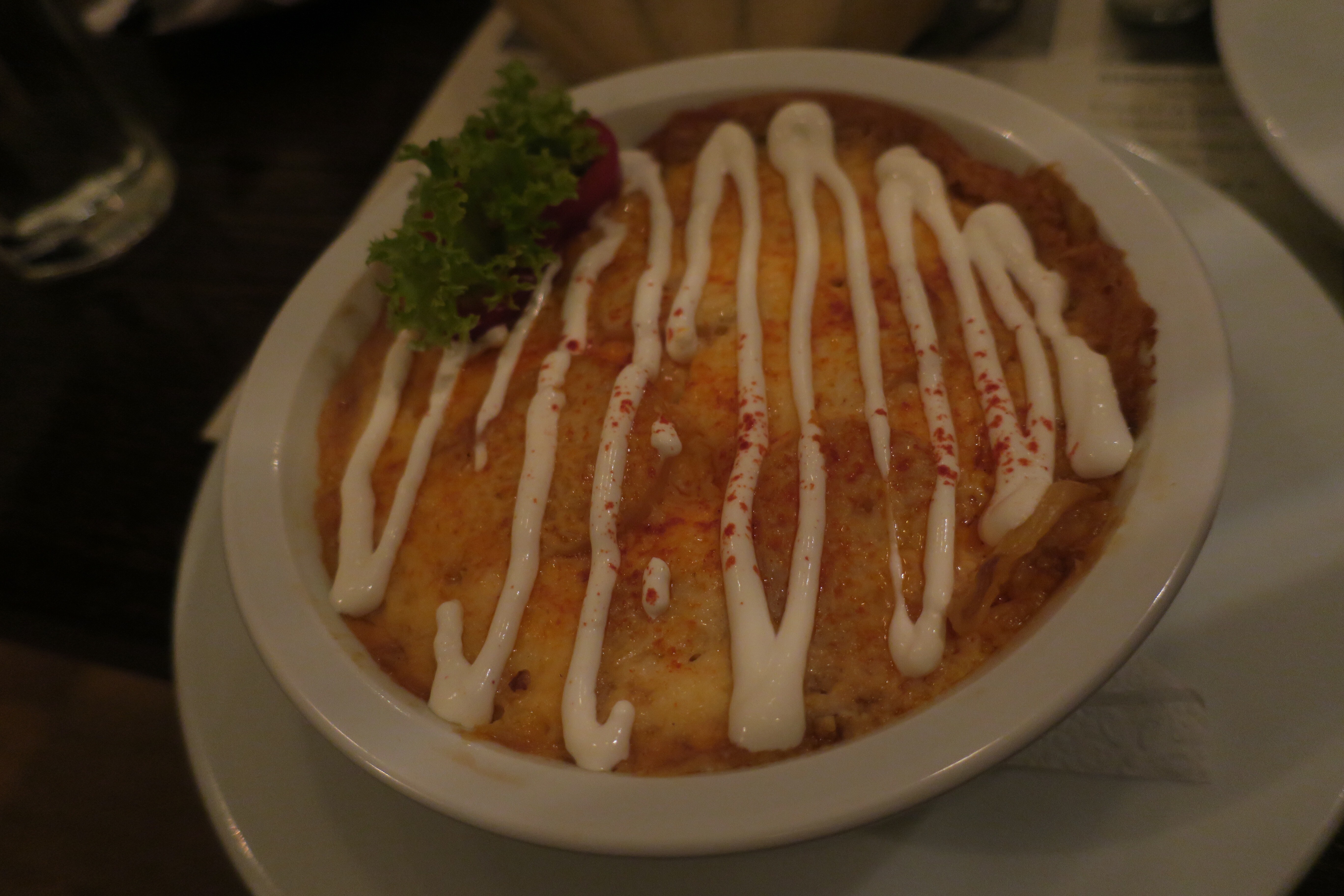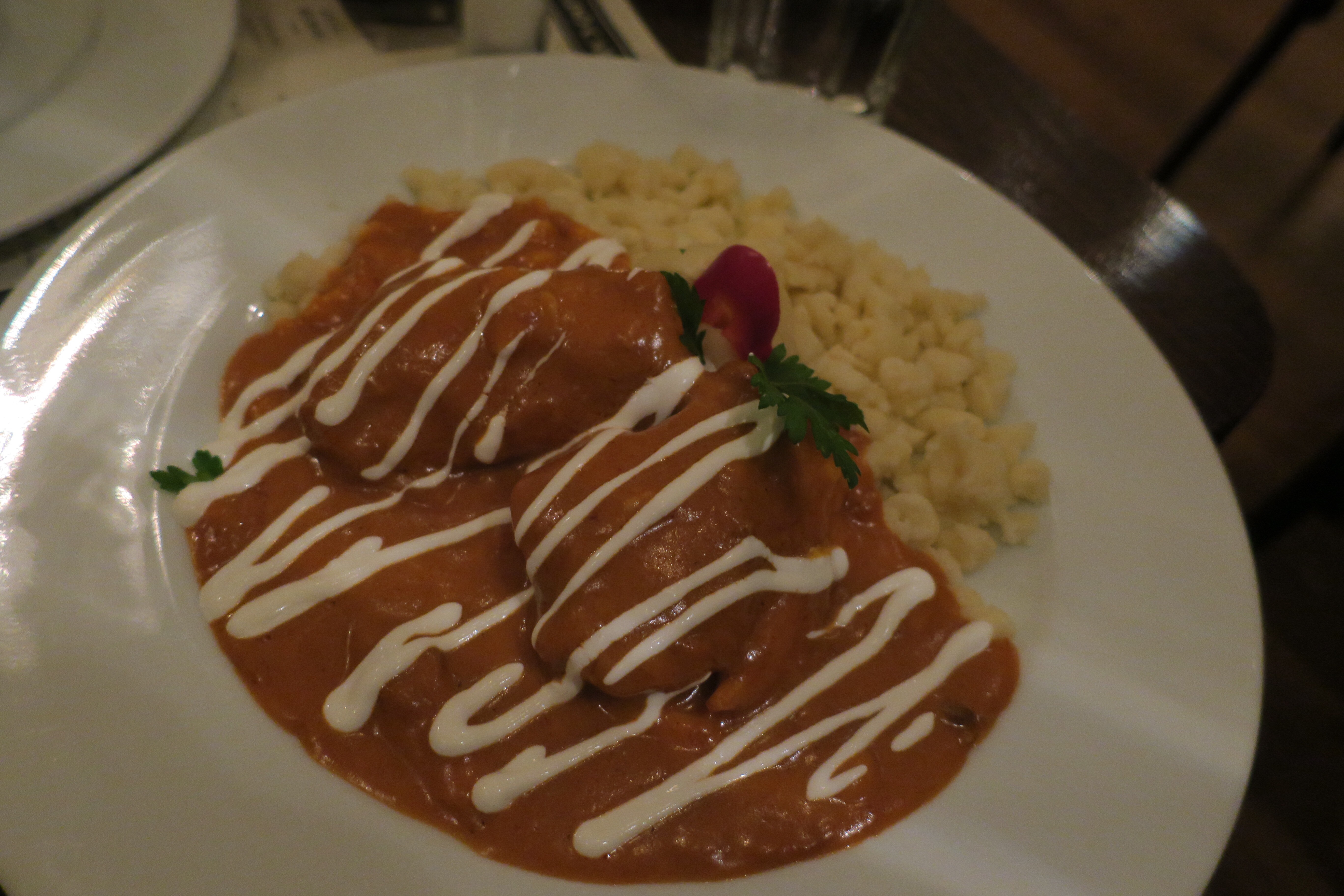 Our last night in Budapest we decided to go a little fancier than usual and not only did Lado Cafe have great reviews, but it was right around the corner from our hotel! The second we walked in our ears were filled with the sound of live jazz, our noses smelled the delicious homemade food and our sights filled with an older crowd dressed up for the night. While it wasn’t a vibe we usually go for, it set the scene for quite a nice night! For starters, another variation on goulash for Dean and a creamy garlic soup for me. Dean’s goulash seemed to be a mix between the other two he had in Budapest. While the broth was thicker than the first place, it wasn’t quite as thick and stew like as the second. The flavor, however, stayed consistent with that kick of paprika! I was curious how my garlic soup would taste. I love garlic but didn’t want it to punch me in the face too much! This soup had the perfect balance. A creamy, smooth consistency with just a hint of garlic…perfection! I knew I wanted to get Chicken Paprikash again to see how it would compare from the first time I tried it, and when it arrived at the table I knew immediately it was the right decision! The sauce was much creamier which is always better in my book. The chicken was extremely tender and the tiny dumplings were the perfect vessel for it all. I’m still drooling over it! Dean got Rakottkrumpli. While normally a dish best suited for winter and not a hot summers evening, it was great to try another Hungarian comfort food! A hearty serving of sliced potatoes on top of a bed of crumbled Hungarian paprika spiced sausage. The whole thing was studded with hard boiled eggs and then topped with some sour cream and cheese and baked. Then, just as it’s served, more sour cream on top! While this dish would be right at home at a breakfast table, it was a great dinner and we can see how this would get you through a cold harsh Hungarian winter!