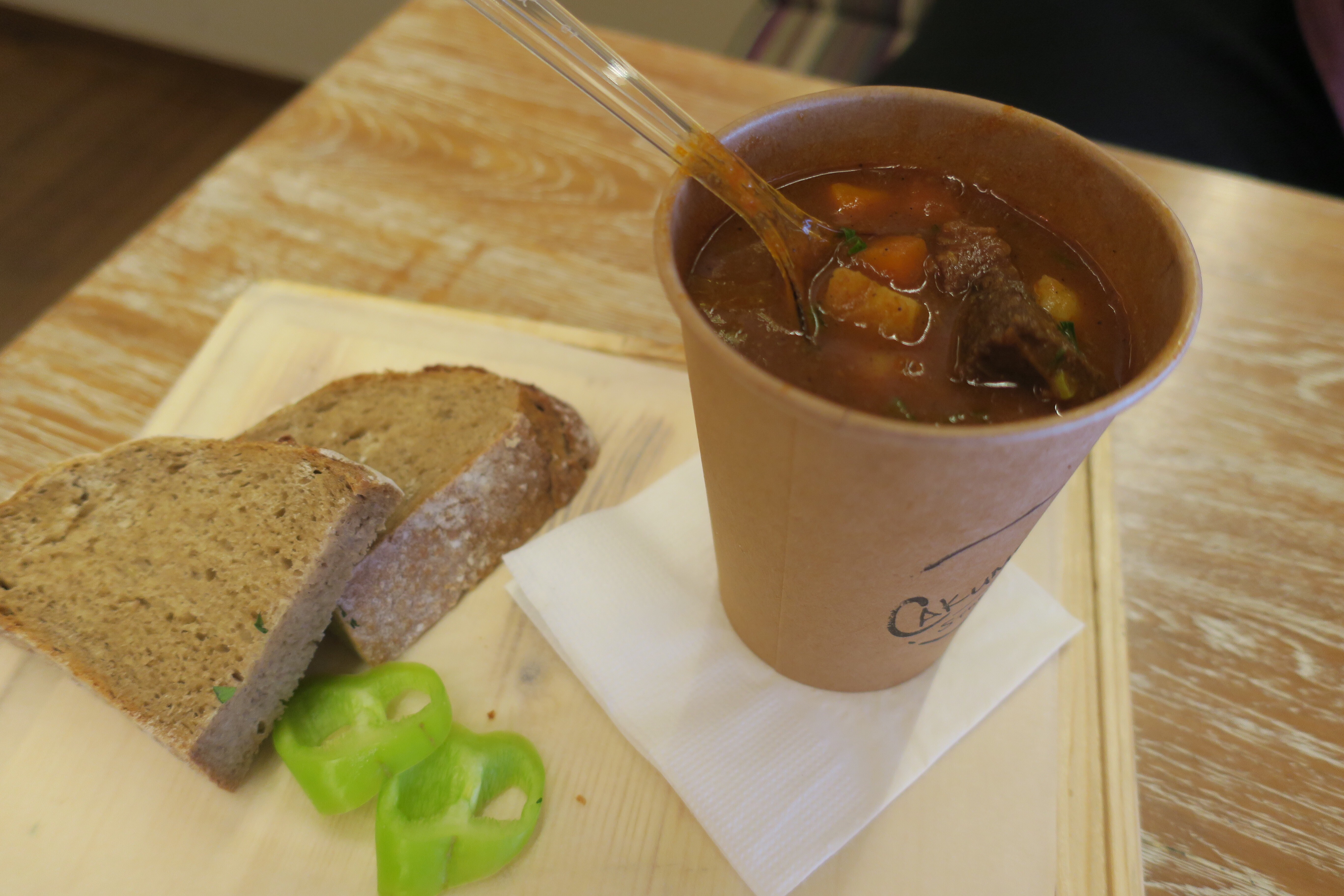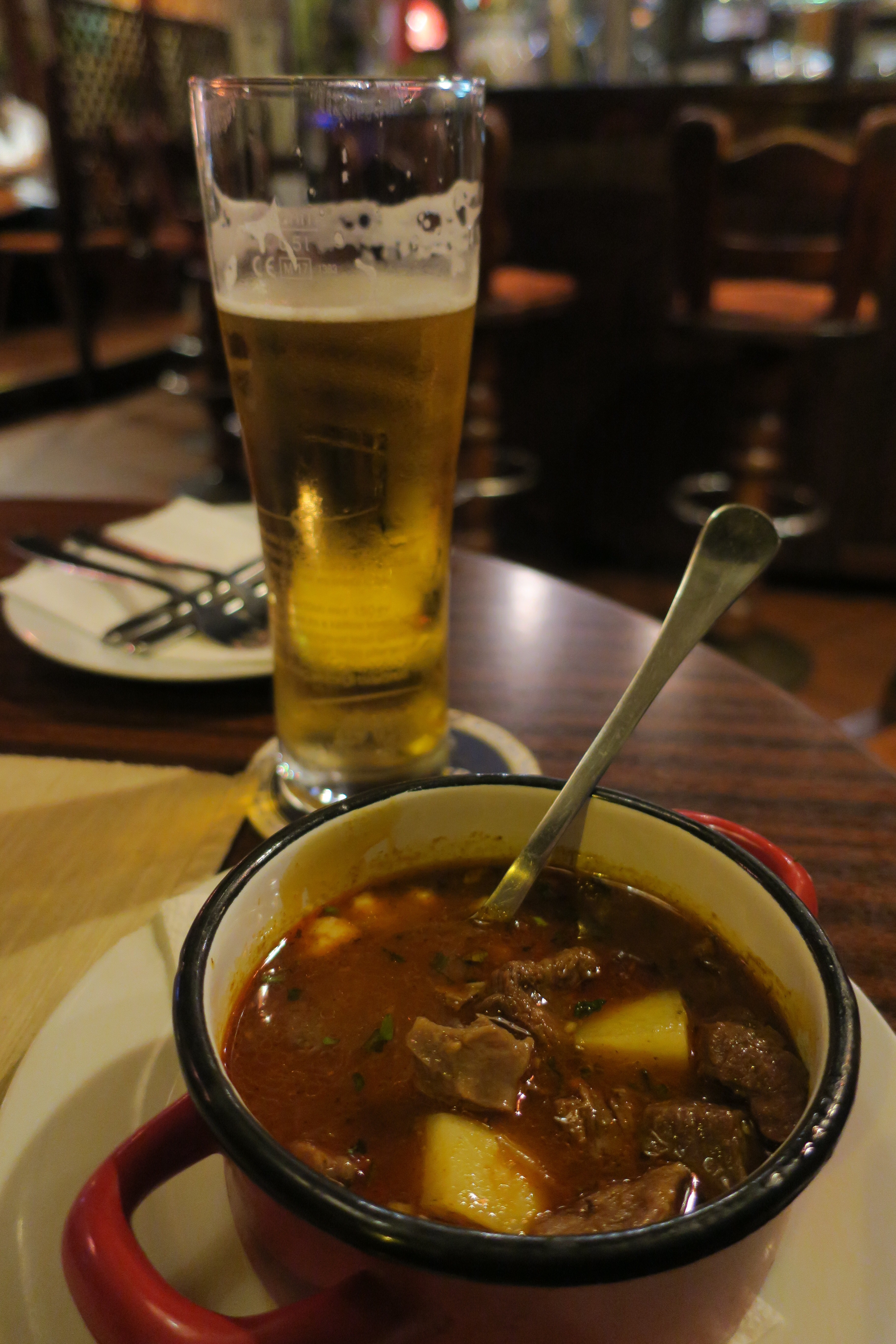 Our first Hungarian meal definitely didn’t disappoint. First, beers (no we didn’t cheers)! Next up we had to try the famous Hungarian Goulash. (Side note: Hungarian goulash is not a rich thick hearty stew as most might think, and definitely not a dish with macaroni and ground beef topped with cheese!) Rich paprika broth with tender beef, potatoes, parsley. Such intense Hungarian paprika flavor! Main meals consisted of fried chicken breast coated in sour cream and covered in shredded cheese for me with some potato croquettes too, yum! Dean got a Gypsy Steak which was a pan fried pork steak with crispy onion on top of french fries topped with a fried egg. They added a piece of back bacon both for our viewing pleasure and to taste, he loved it!