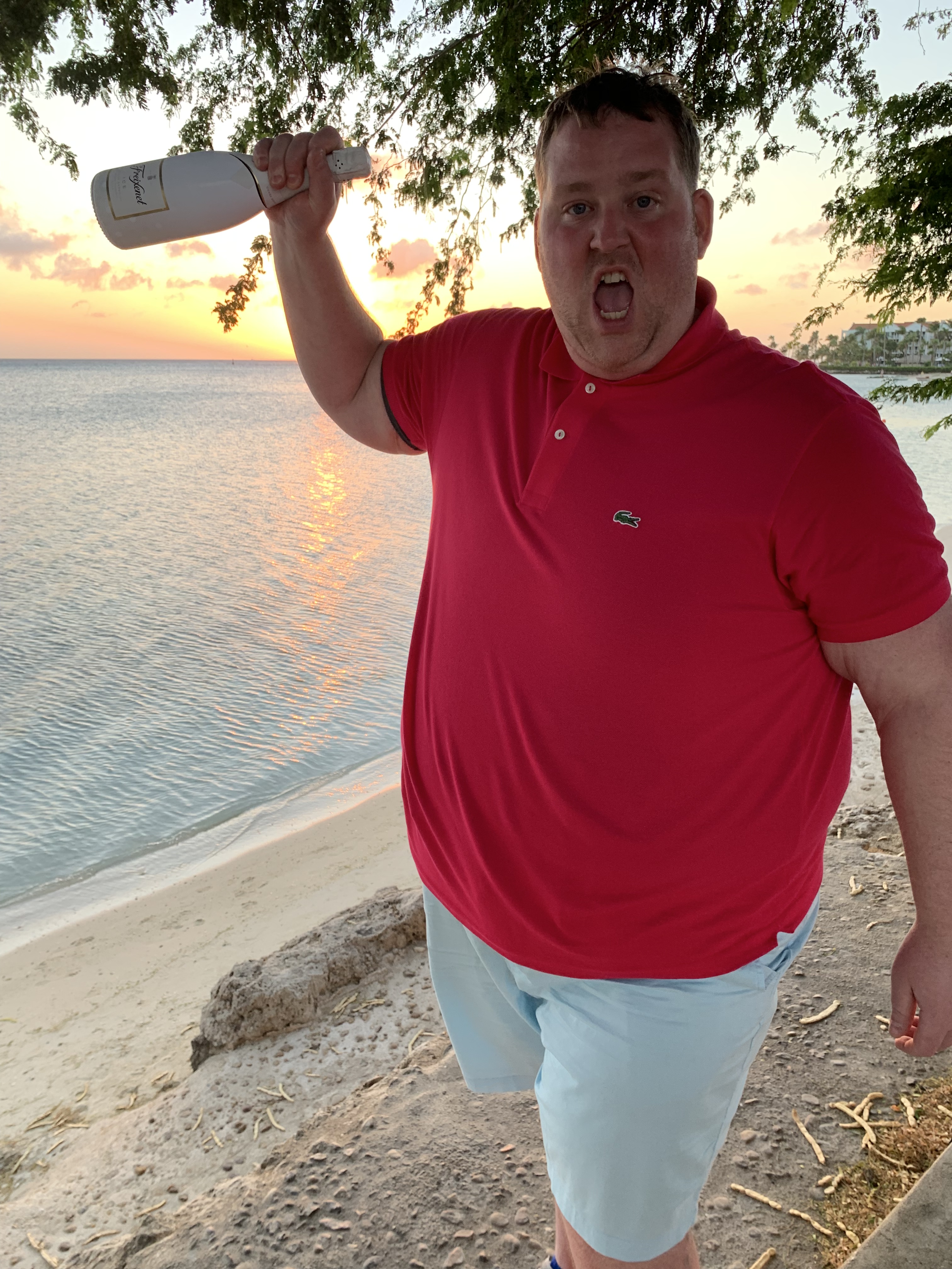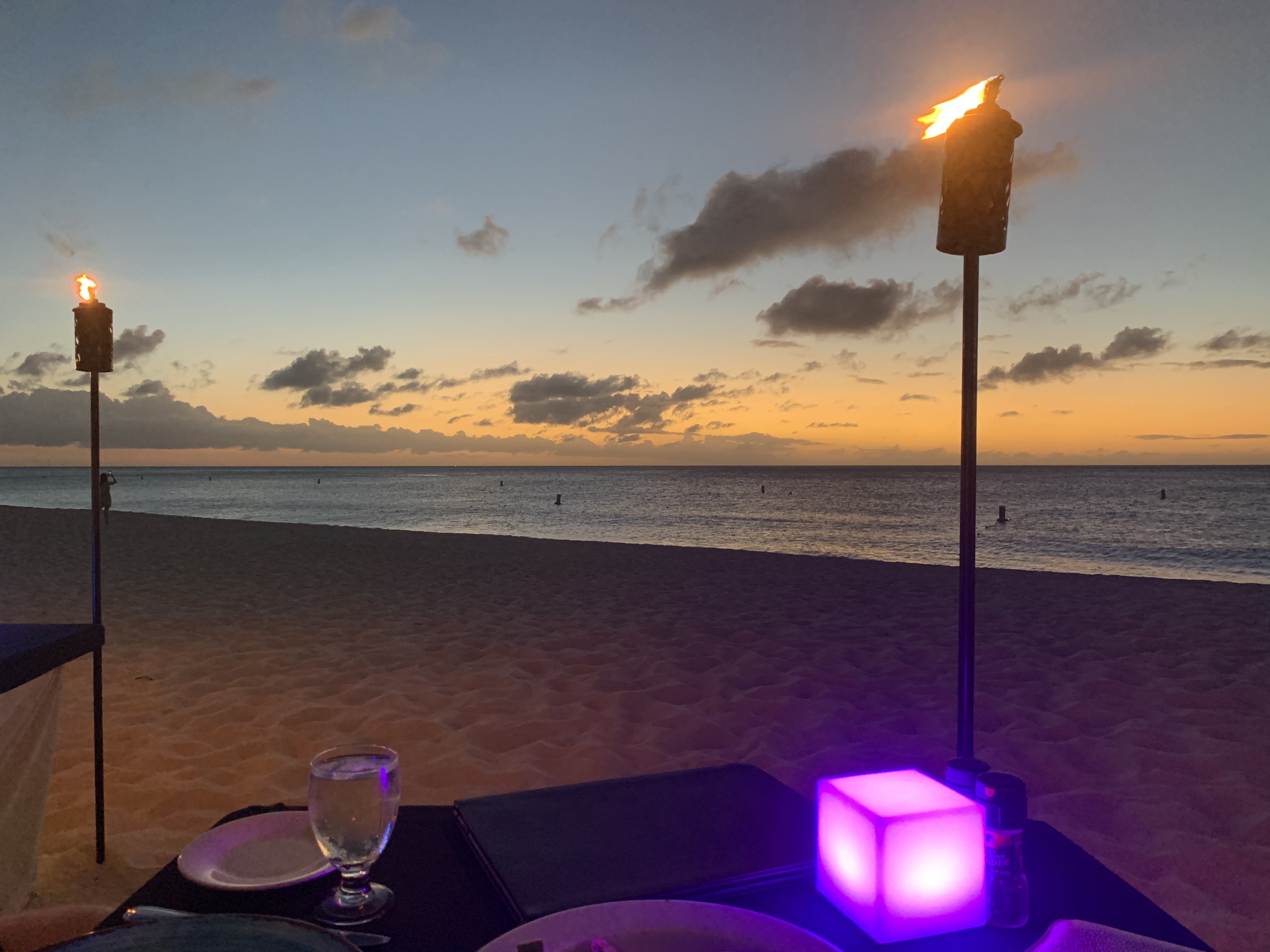 After our photo shoot it was time for sunset and dinner. A few months prior we were researching of where to eat and came across Passions on the Beach, where you can actually have dinner ON the beach! Tables, chairs and toes in the sand!? Say no more! We booked a time right at sunset and were lucky enough to have gotten a front row table, right in front of the gorgeous sunset, which would be our show for the night. We paired the sunset with glasses of Rose and started our meal with samosas to share and a bowl of their famous Caribbean Coconut Chicken Soup…OMG THAT SOUP! We could have had just that for our entire meal and been two very happy people. The coconut flavor was so prominent and fragrant and the chicken was so tender… yum! The samosas, not to be forgotten, were super crispy and exploded with Indian spices in every bite. They were served with a lavender scented polenta which was just as delicious as it sounds. For our mains, I got the tender chicken breast with garlic mashed potatoes (yum!) and Dean chose the slow roasted Lamb Shank, both cooked to perfection and melted in our mouths. As the night went on, the evening got more beautiful by the minute, with the sun setting and the waves crashing. As the dark night sky crept up on us, lanterns were lit and set the mood even more. We couldn’t have asked for a more perfect evening. Truly a night to remember and one that will be hard to match! Dessert was presented in true Julie style with a sparkler in cheesecake to celebrate the big 3-0. As if this place didn’t impress us enough!! If you are looking for a true Arubian experience, Passions on the Beach is a must!