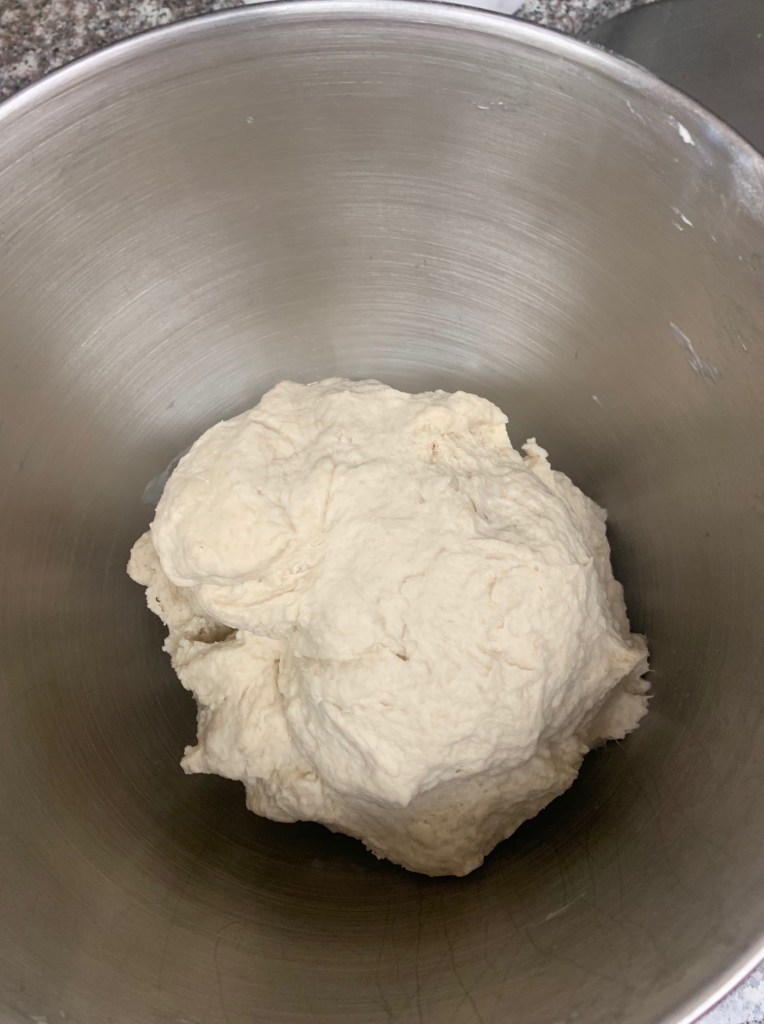 When adding the water, make sure that the dough picks up all of the flour, it should be slightly tacky, not dry, but not a moist loose mass. See the photos to get an understanding of of how it should look. We like to take the dough out of the mixer and do some hand kneading too. To do this, take the dough and push it out forward, then, fold the dough back up on itself and repeat. Turn it 90 degrees and repeat. We do about 5 minutes of hand kneading, this will help to create that chewiness by developing the gluten, and why it is best to use a high gluten or bread flour.