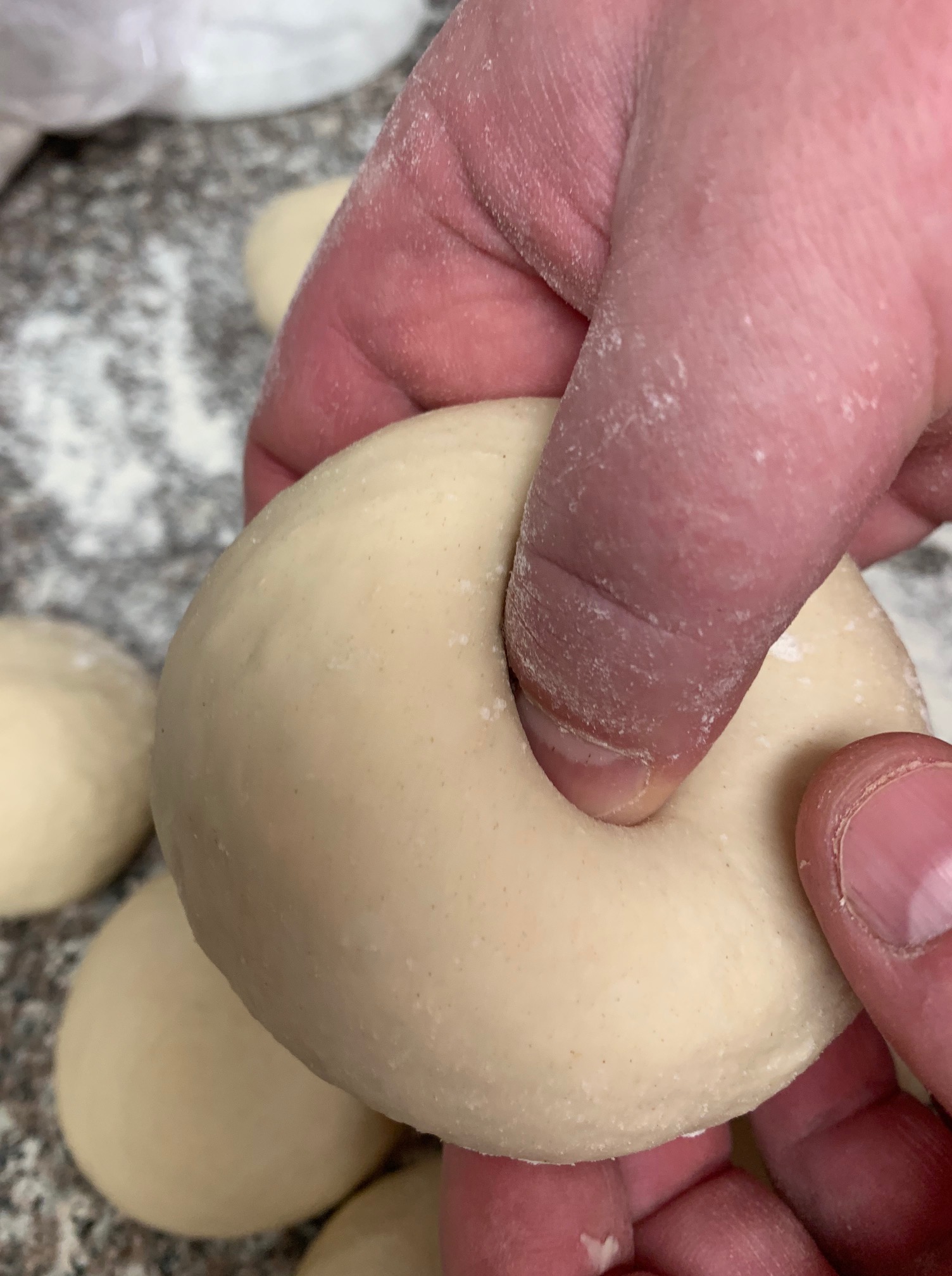 Next up, form the famous hole. Start by pinching the dough in the center between your thumb and pointer finger, as you do this, gently start to punch through, and then very gently tug until you get a big hole, about 1.5” wide. This may seem like a big hole, but the bagel will grow, so don’t worry.