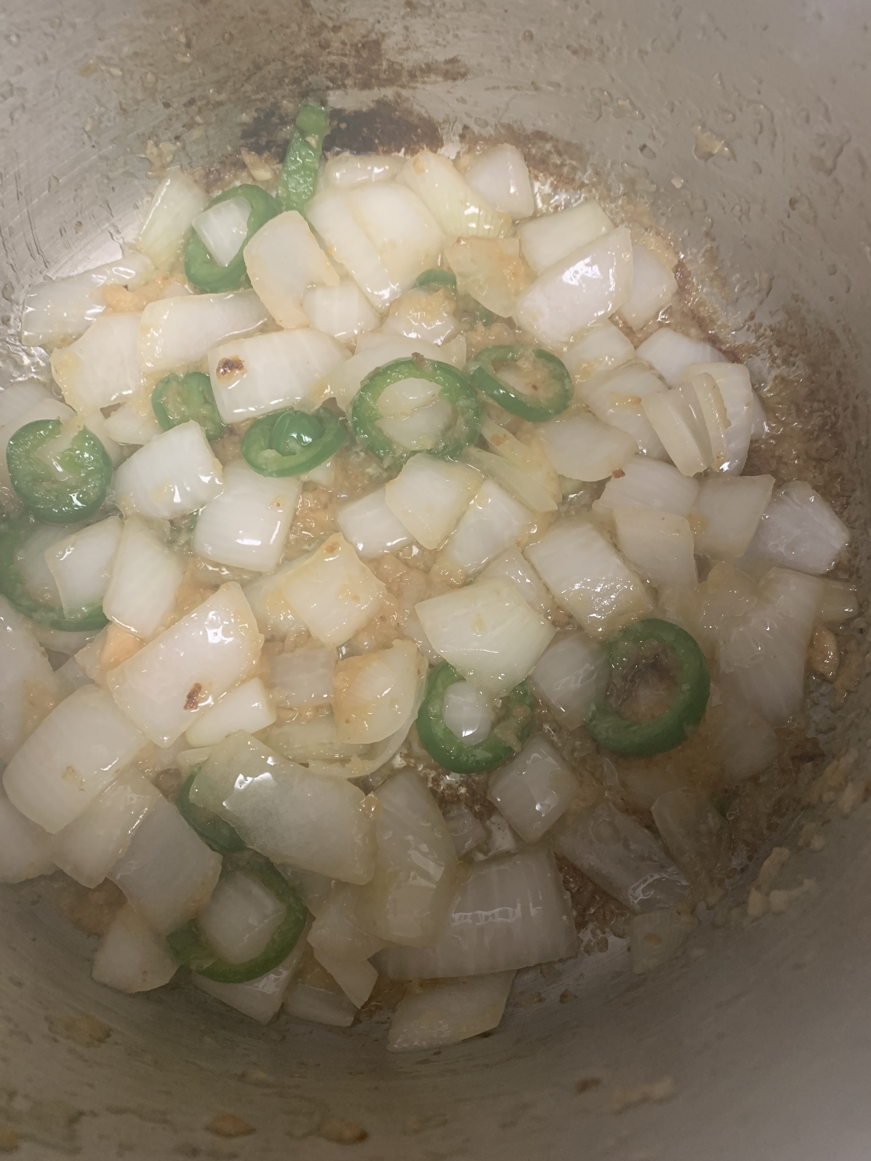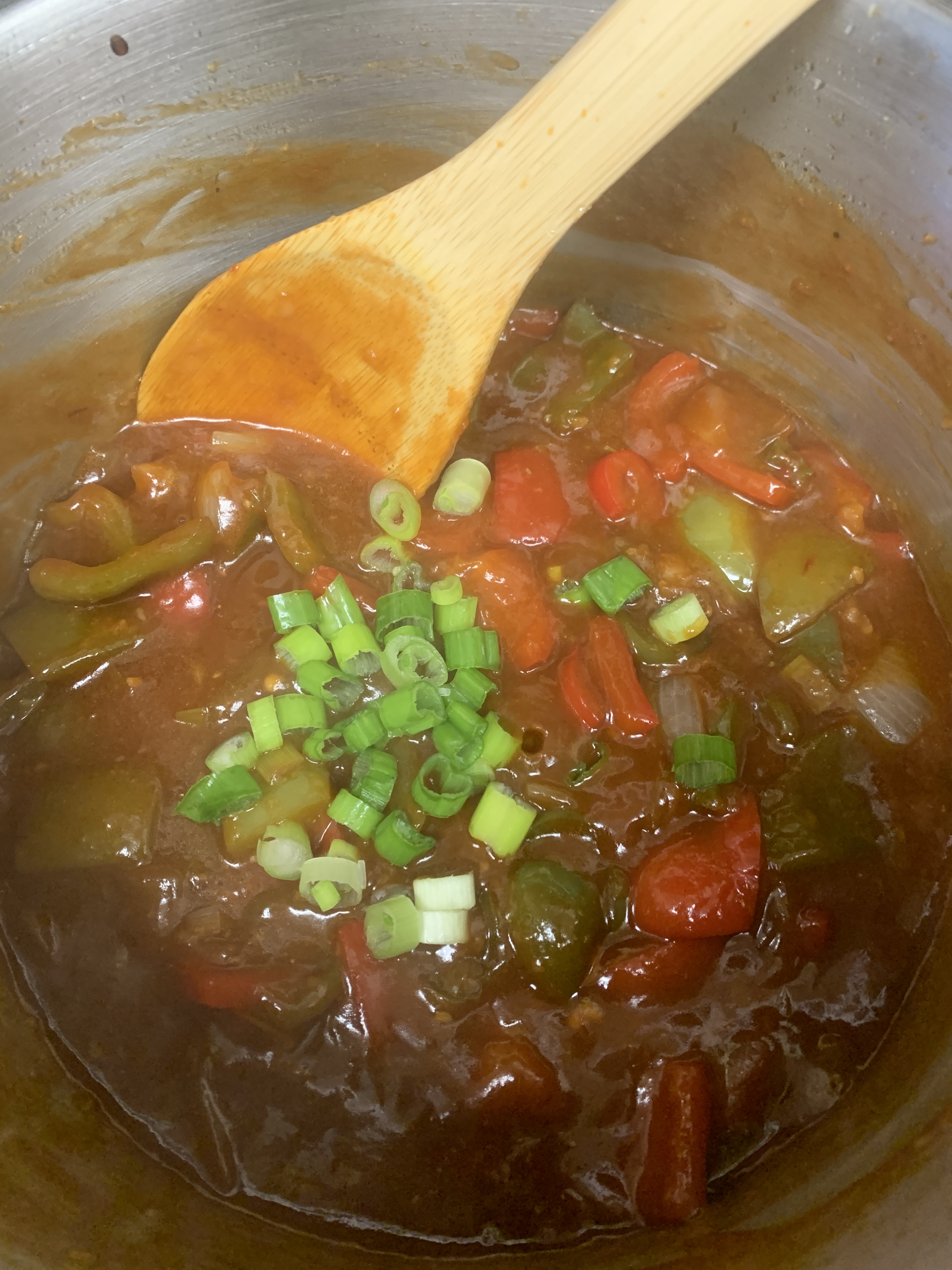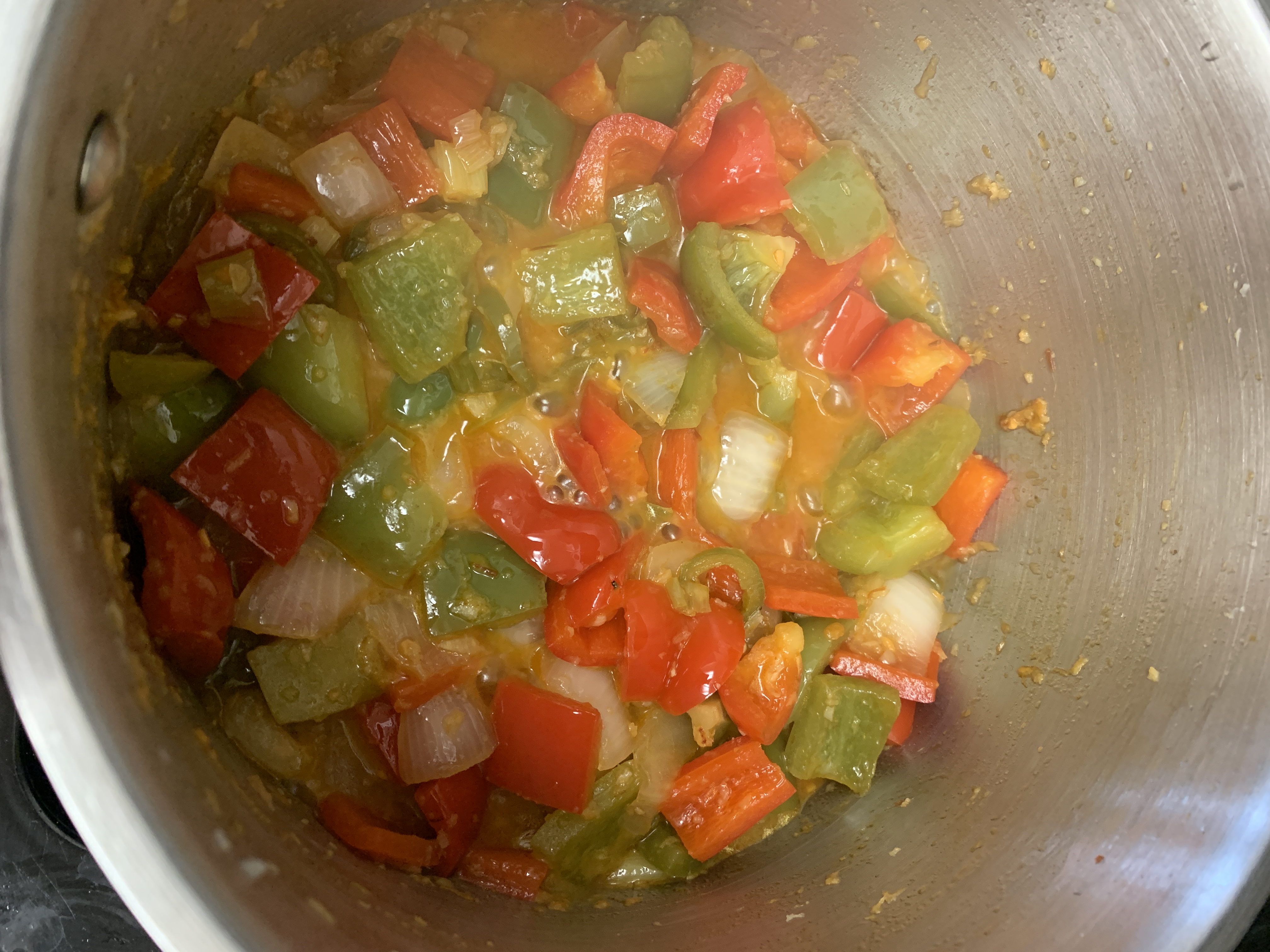 Now it is time to make the main Chili Paneer sauce. Heat your neutral oil in a large saucepan over medium low heat. Add the minced garlic, ginger and jalapeños, stir fry these for 3 minutes, be careful, the ginger will want to stick to the bottom. Add the diced onions next, fry these until they are translucent, then add in the cut bell peppers and continue to cook. Add in the vinegar, and about 1/2 cup of water, cover and simmer for 5 minutes, this will soften the peppers and create a base for the sauce. Next up, add the Szechuan sauce and ketchup, stir it in, and reduce the heat to low.