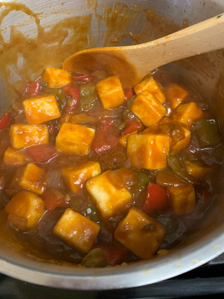 After the paneer is fried, you can add them to the sauce. If you want to amp up the heat, add more of the chili sauce. The overall flavor should be a sweet and sour profile with a hint of sesame. We love it served with our Basmati Pilau Rice!