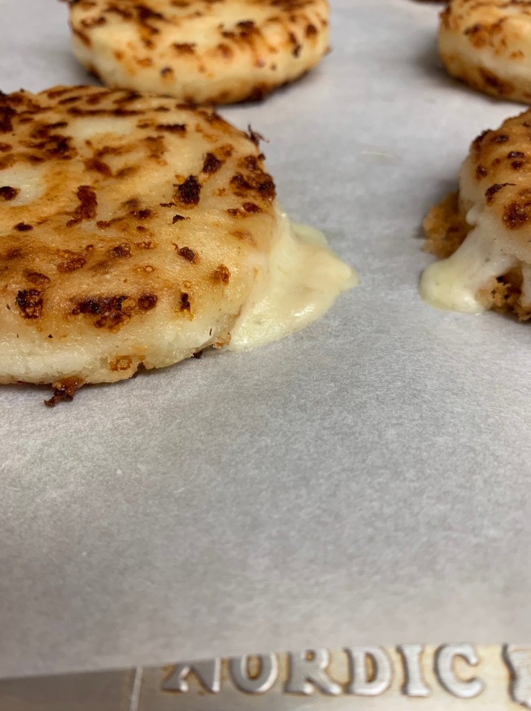 Now, to form the arepas, if you follow our recipes, you know we are fans of measuring out with a scale, you don’t have to of course, but we did with these, and made each 3oz dough ball. Form the dough into a rough flat circle, then take the cut cheese and place it in the center. Fold the edges of the dough onto itself until you get a nice round flat patty, making sure not to let the internal cheese poke through.