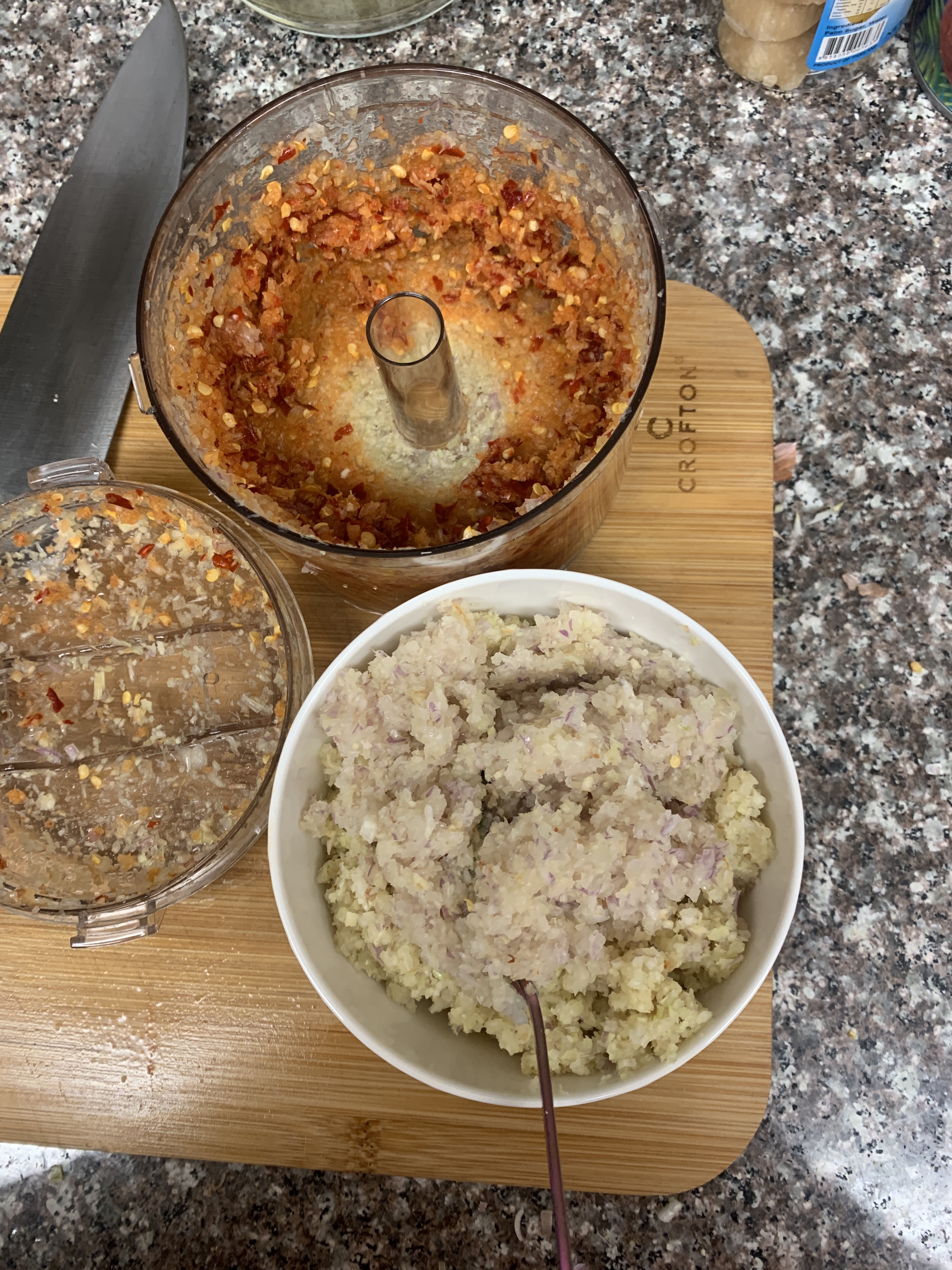 First you will want to make your spice paste, we roughly chopped the ingredients and put them in our mini food prep and blitzed it until it it was smooth. We found that adding some oil (canola or vegetable would be be fine) helps to loosen it up and make it easier. If you have a mortar and pestle, you can use that and be authentic.
