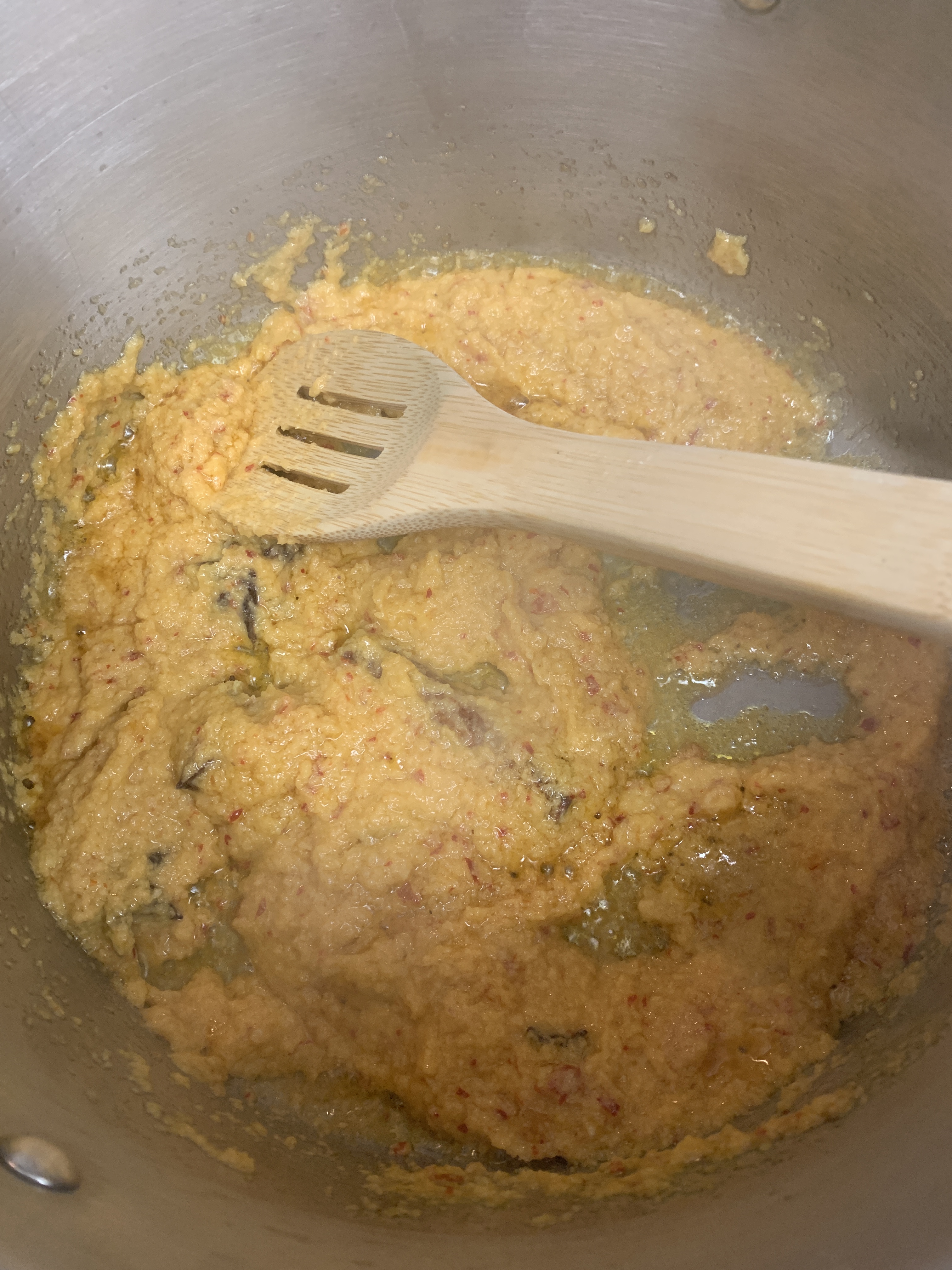First step is to fry the paste that you made. Fry the paste in a large wide skillet with tall sides (if you don’t have this, a sauce pot will do) with the cooking oil, and the cinnamon, cloves, star anise, cardamom and nutmeg. Fry this over medium heat until the paste starts to become fragrant.